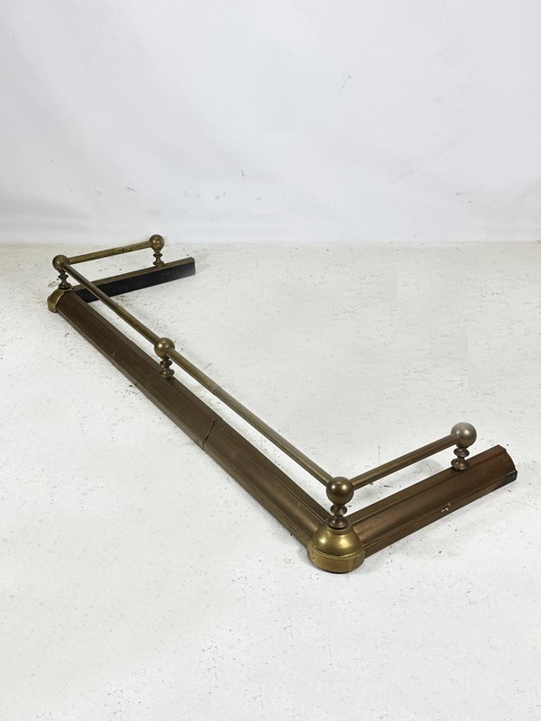 A beautiful antique brass fireplace fender featuring an adjustable extending design. The fender showcases a lovely contrast between the rich, aged patina on the smaller (unextended) sections and the brighter, shinier brass on the extended areas. Decorative turned finials and smooth rails add a touch of classic elegance. Perfect for adding warmth and vintage charm to any hearth.