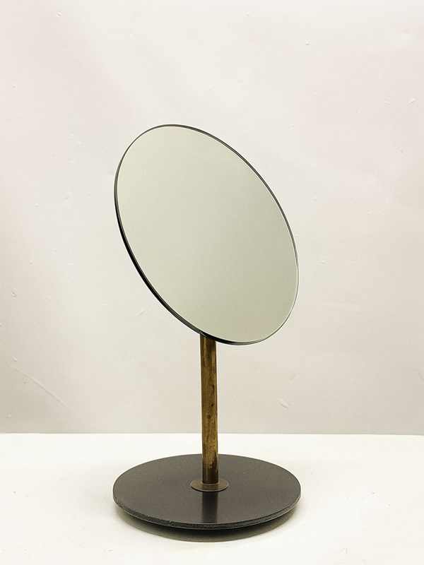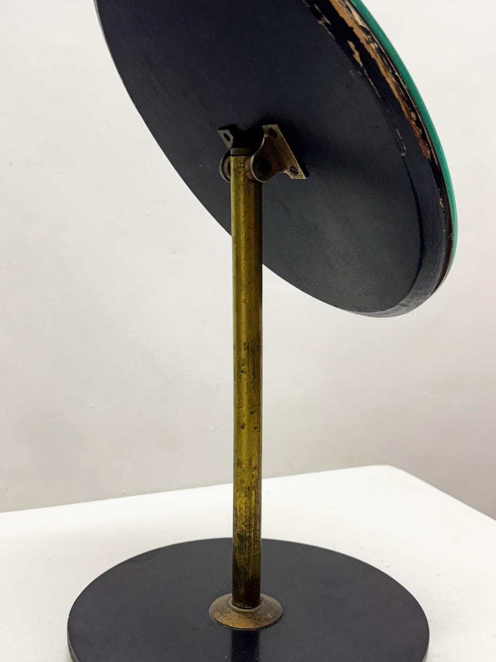 Featuring a sleek oval mirror mounted on a sturdy brass stand, effortlessly combining vintage charm with modern minimalism. The mirror plate show small patches of foxing, whilst giving a good reflection.