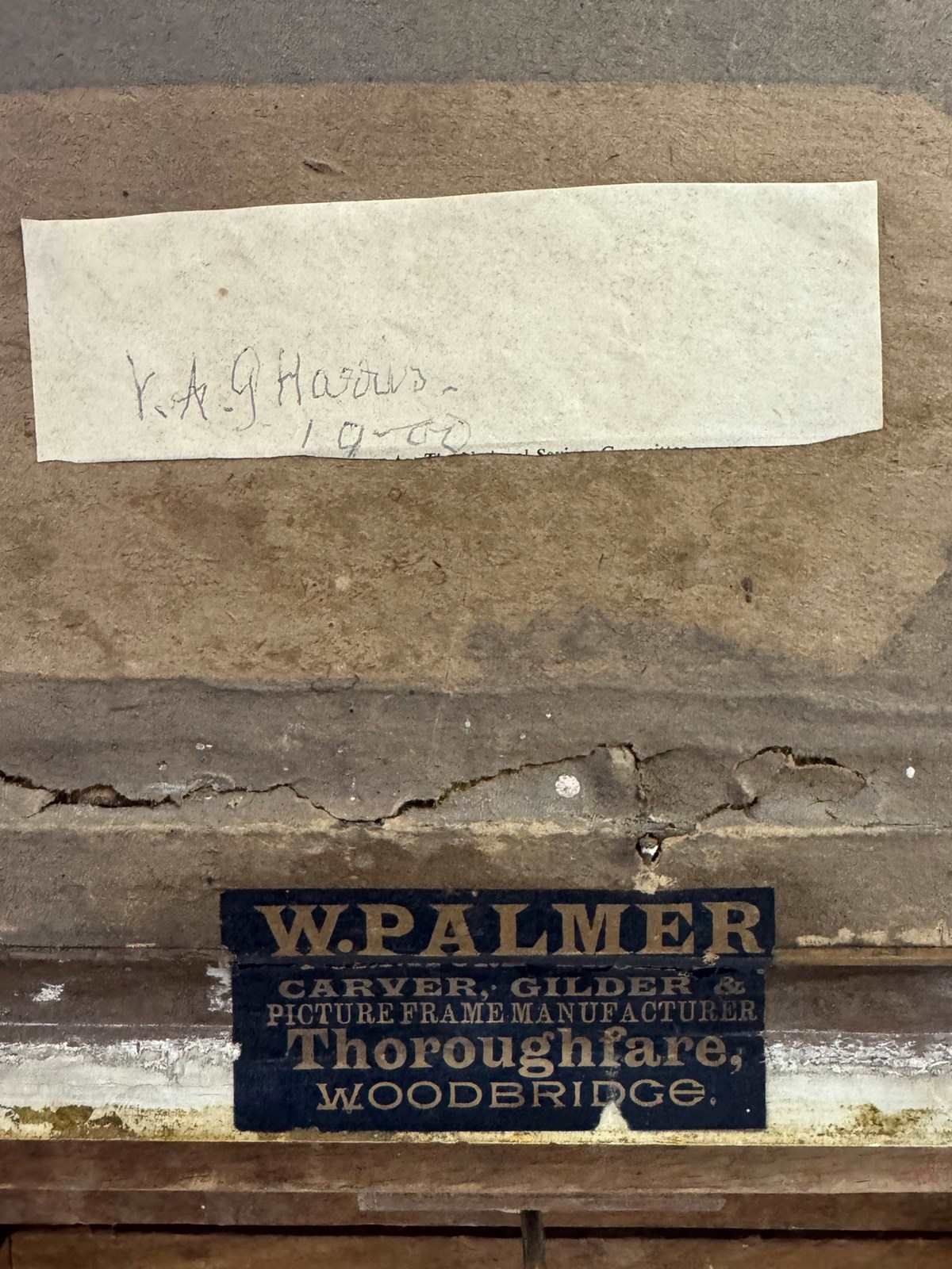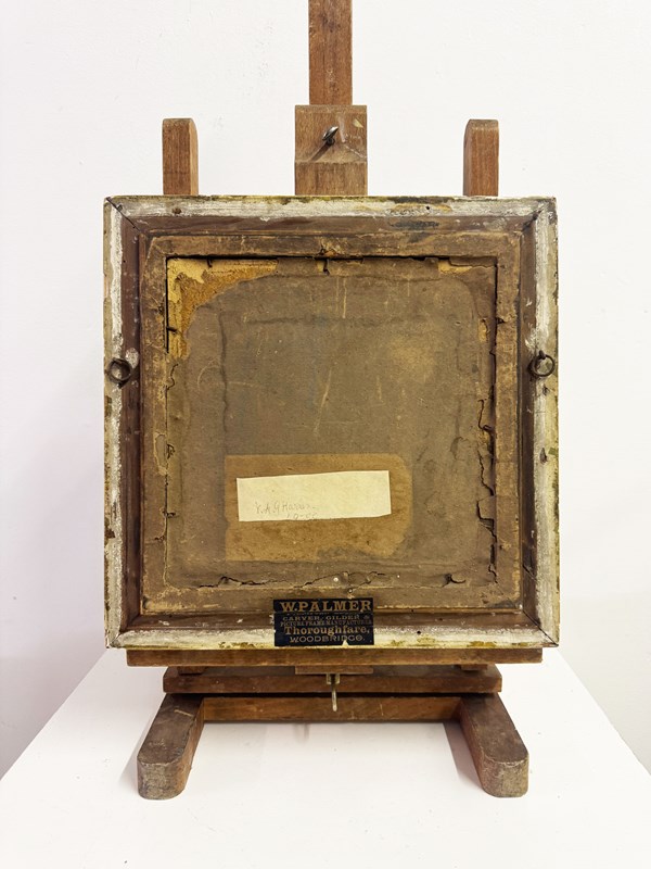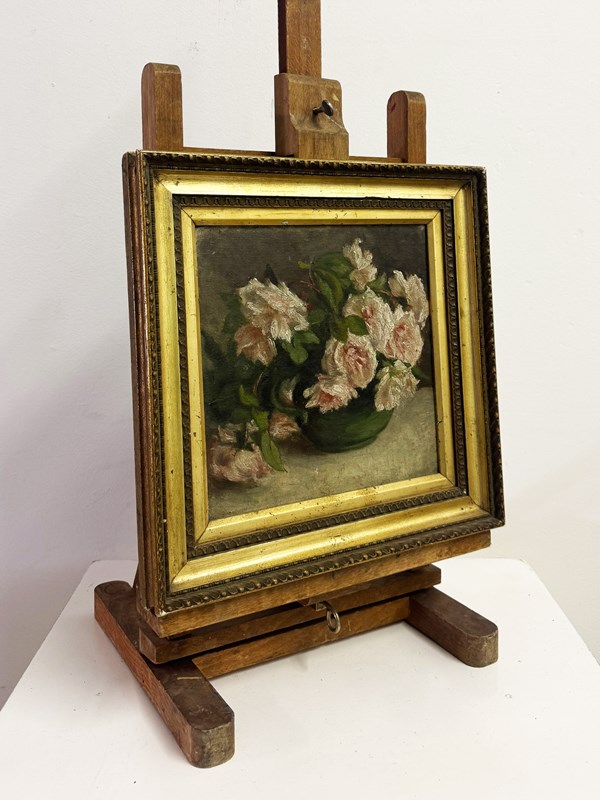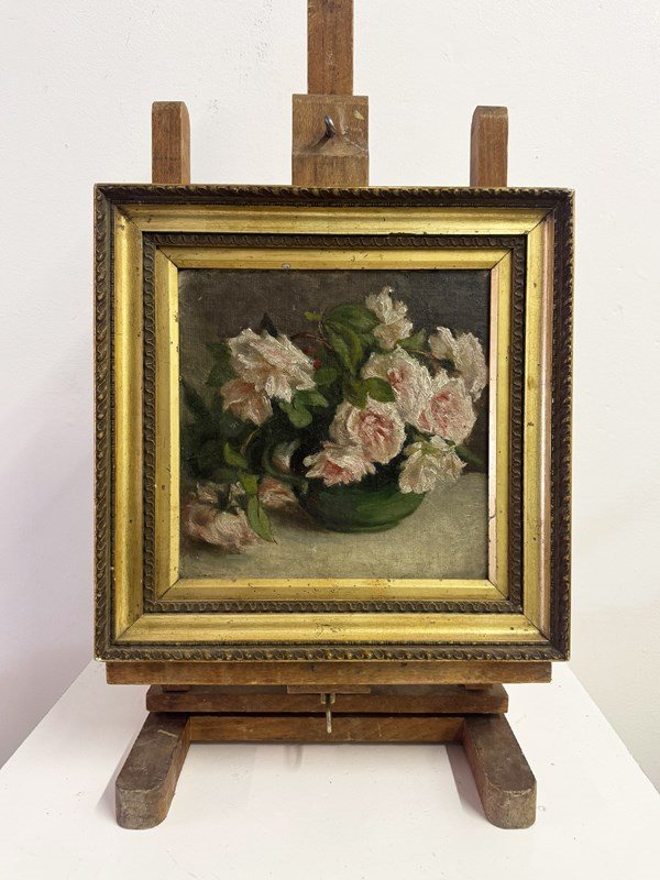 Antique oil painting of pink roses in a bowl, dating to the late 19th or early 20th century. The piece features soft, impressionistic brushwork and is presented in a decorative gilt frame with a label for W. Palmer, Carver, Gilder & Picture Frame Manufacturer, Woodbridge on the reverse. A handwritten label is also present on the back. W: 34 x D: 3.5 x H: 34 cm