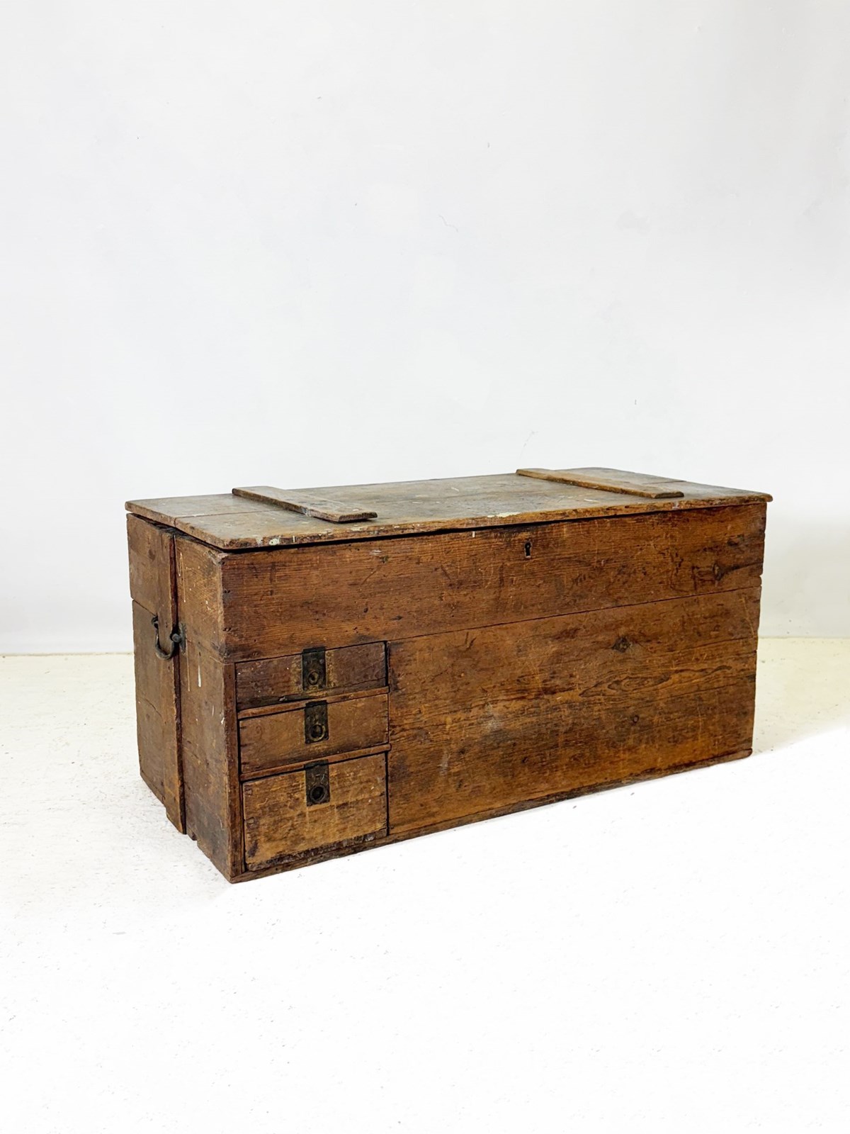 This beautiful antique wooden trunk is full of rustic character and history. Handcrafted from solid pine, it features a rich, naturally aged patina and shows wear consistent with age and use. Originally built as a carpenter’s trunk, this piece combines practical storage with timeless charm. Sturdy and functional, with drawers and hinges in working order.