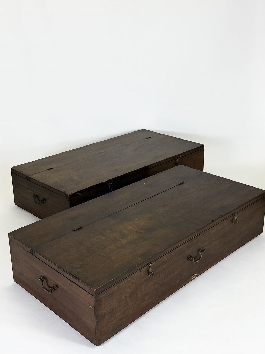 Bring timeless charm and practical storage into your home with this beautiful pair of antique wooden trunks. Originally used as under-bed storage, these versatile pieces would also make fabulous low coffee tables.