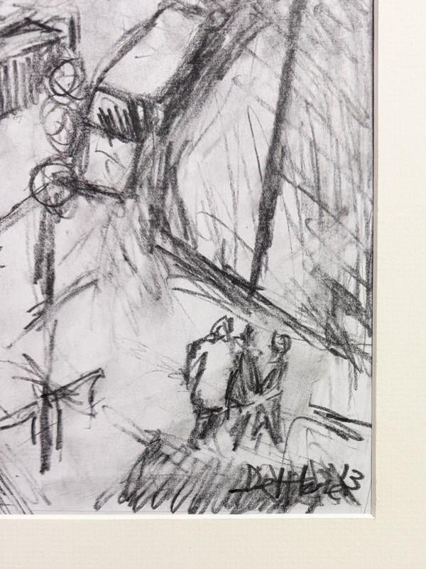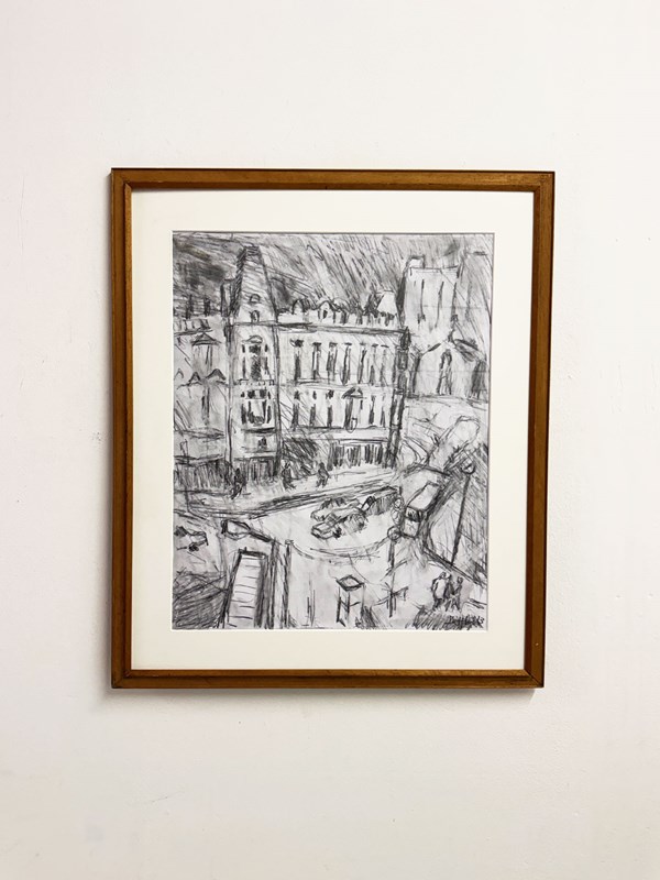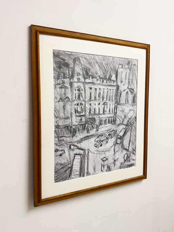 Original charcoal cityscape drawing by Barry De More, featuring an expressive street scene with architectural detail and dynamic line work. This signed contemporary artwork captures the energy and atmosphere of a European-style city through loose, gestural strokes.