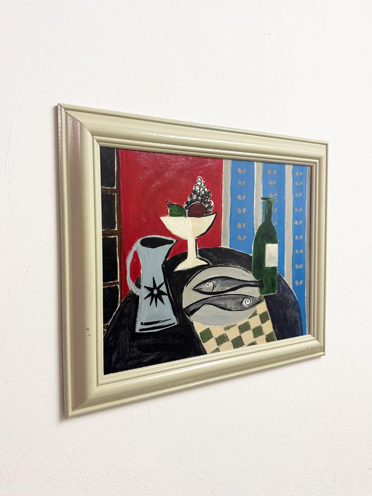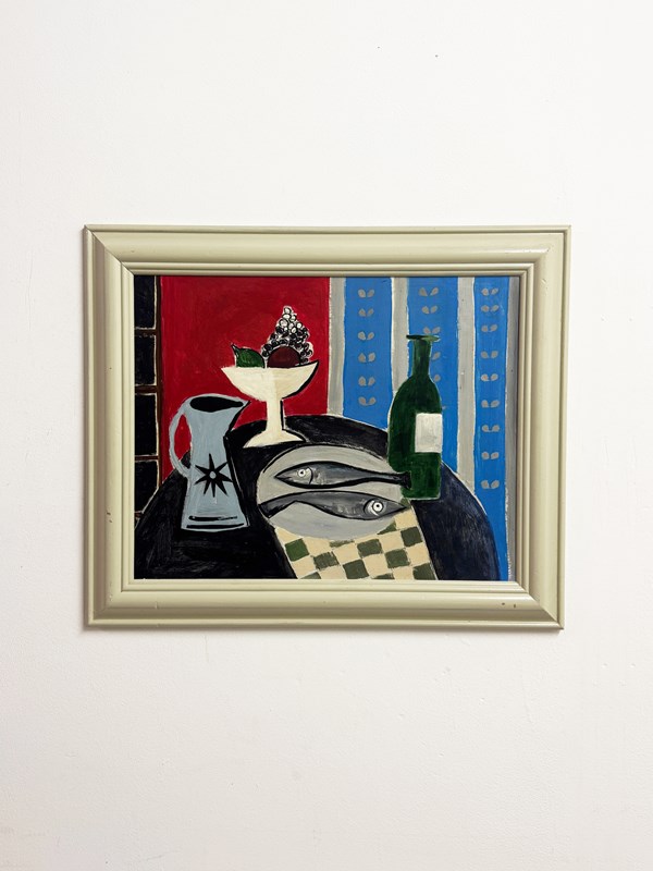A decorative vintage Cornish style still life painting, full of colour and character. The composition features two fish on a plate, a green wine bottle, fruit bowl and jug set against a bold red and blue interior. Painted in a lively modernist manner, the work has a strong coastal influence with simplified forms, confident black outlines and a charming naïve quality. The vintage cream painted frame suits the piece well and gives it a bright, fresh appearance.