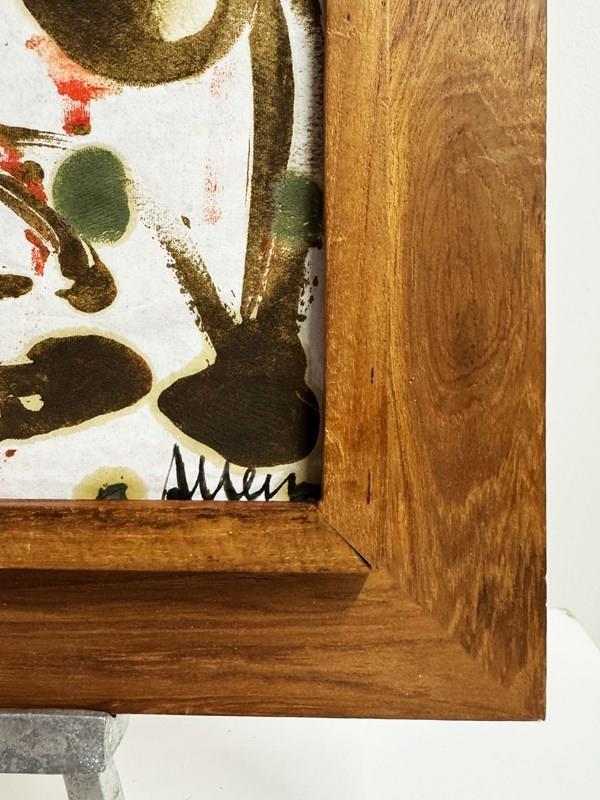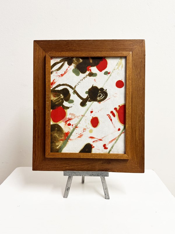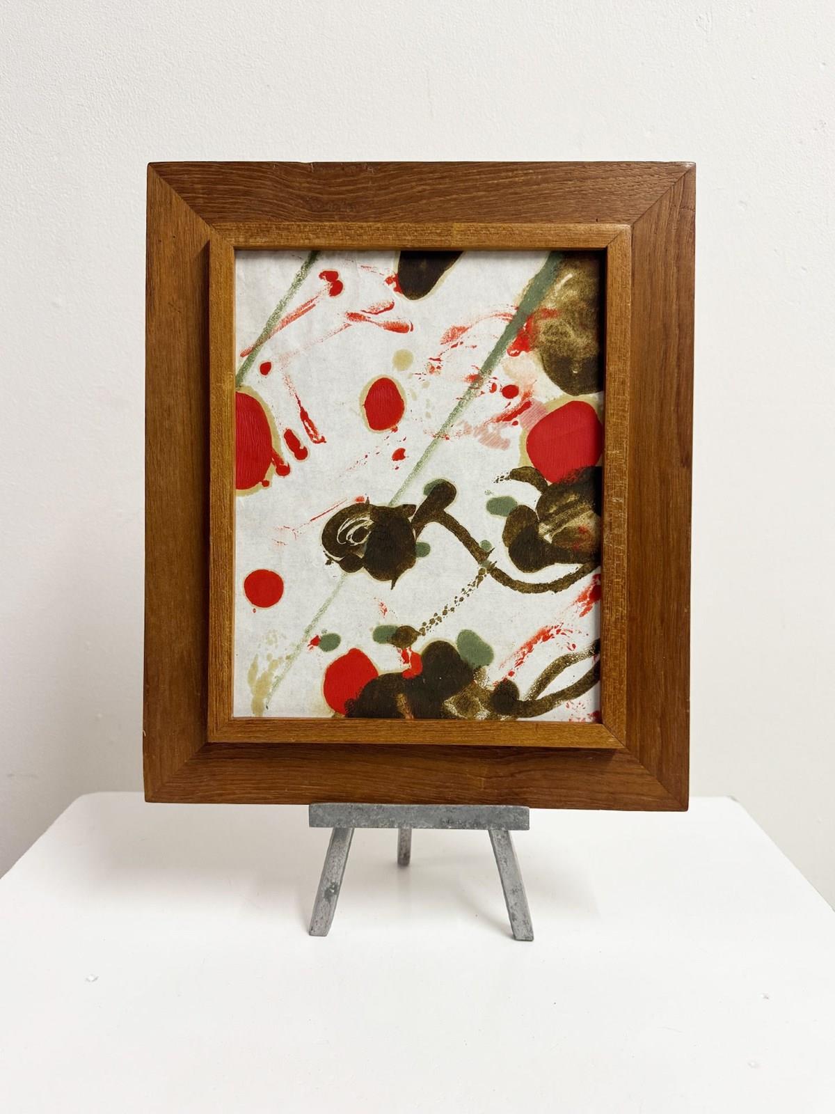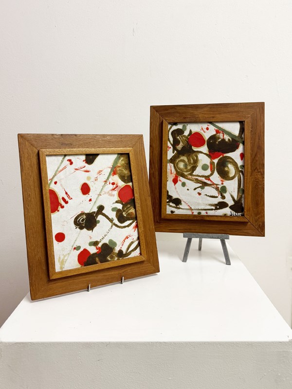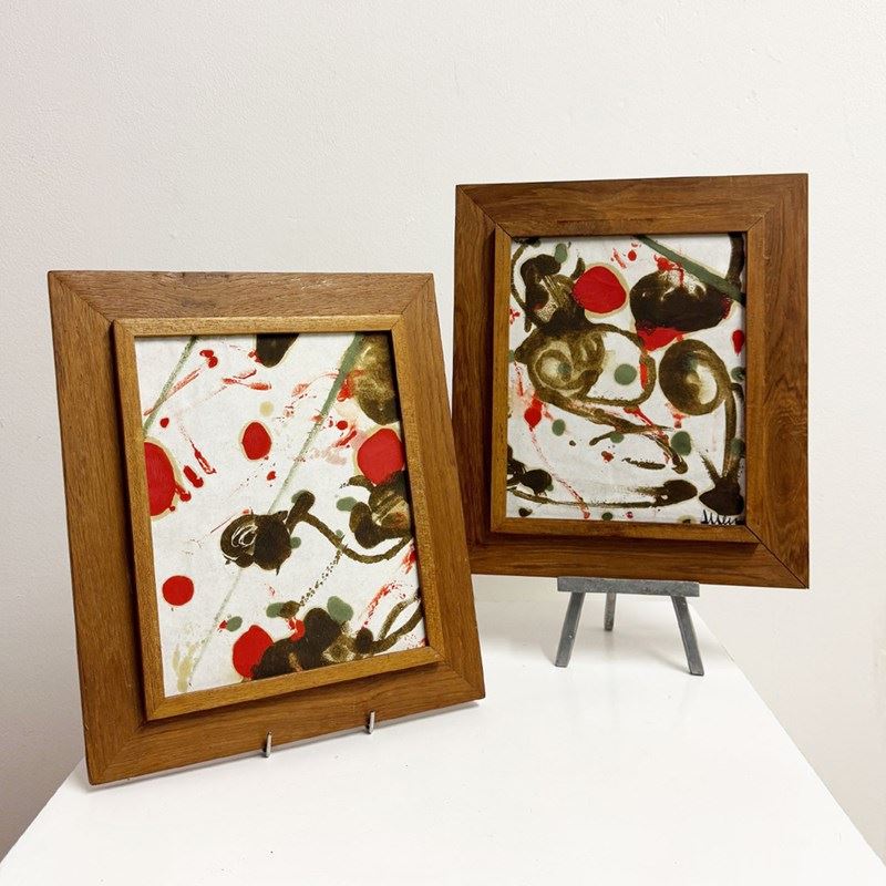 Set of two vibrant mid century abstract expressionist paintings by Dorothea Allen, 1970's (one signed bottom right). Each piece features bold colors and dynamic brushstrokes, framed in period oak frames. Perfect for adding a pop of color to a shelf, desk or gallery wall. Arrive ready to hang.