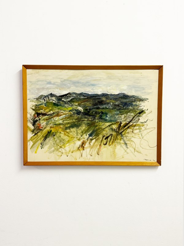 An expressive abstract landscape by Felix Robbins, painted in layered washes of muted greens, ochres and soft greys. The composition evokes rolling terrain and distant hills, with forms emerging fluidly through loose, gestural brushwork.