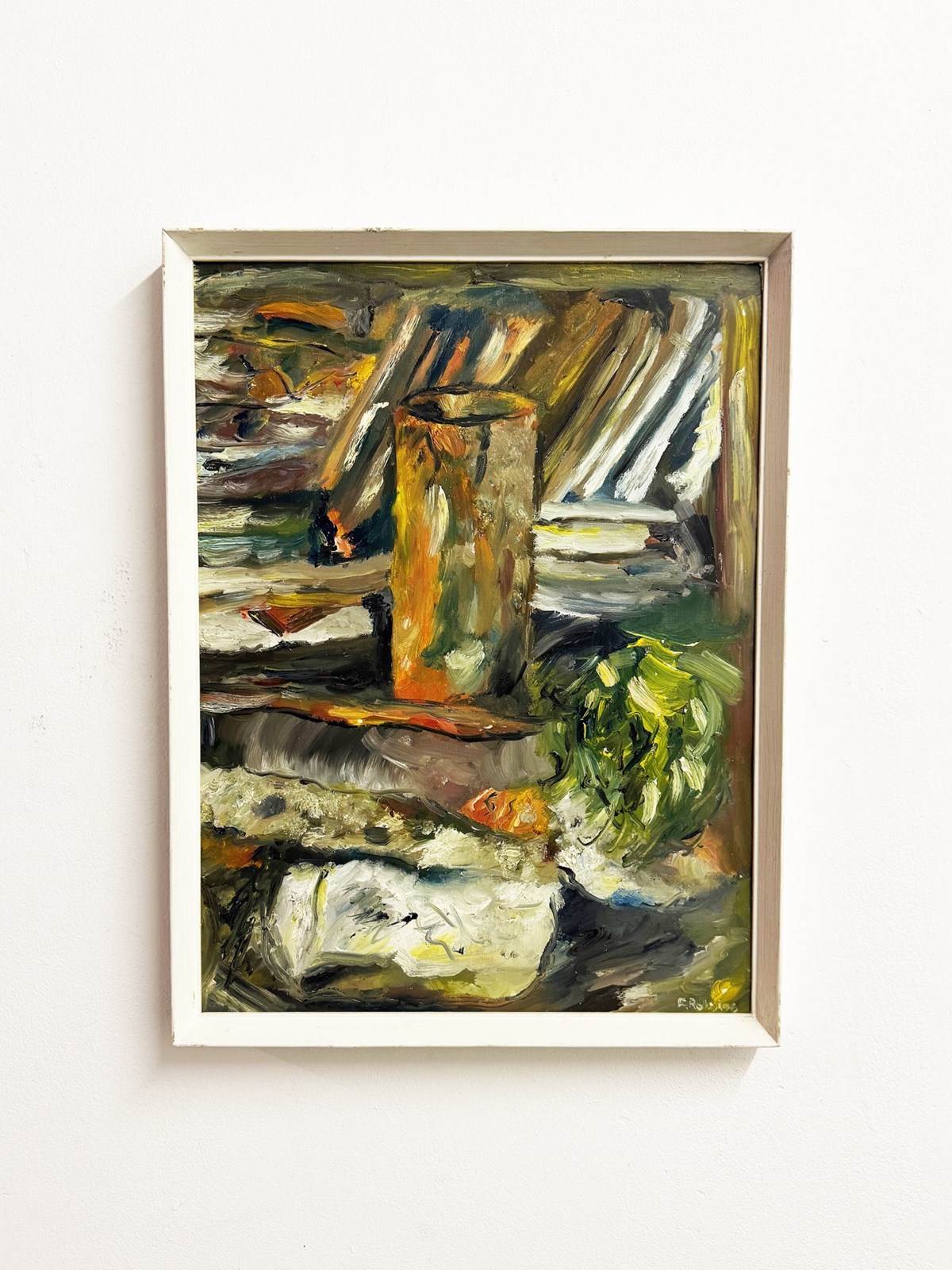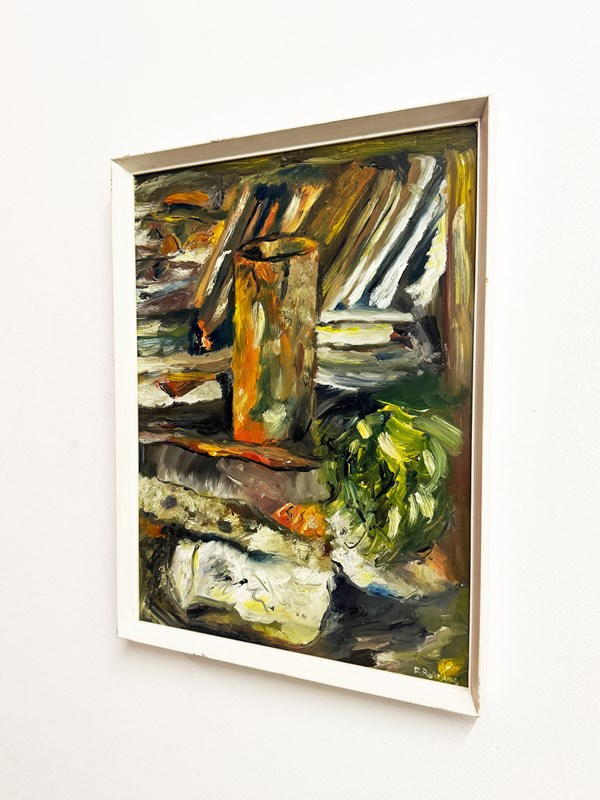 A richly textured oil painting by Felix Robbins, presenting an abstracted still life composition with a strong painterly presence. Executed in confident, expressive brushstrokes, the work centres around a cylindrical vessel set amongst loosely defined forms suggestive of a tabletop arrangement, with layered background elements that hint at interior space.