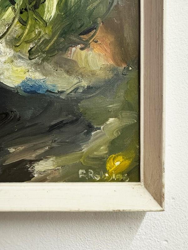 Signed to the lower right, the painting carries a distinctly modern British studio feel, sitting comfortably within mid to late 20th century abstract traditions. A strong decorative piece with real substance. Presented in a simple painted frame and ready to hang.