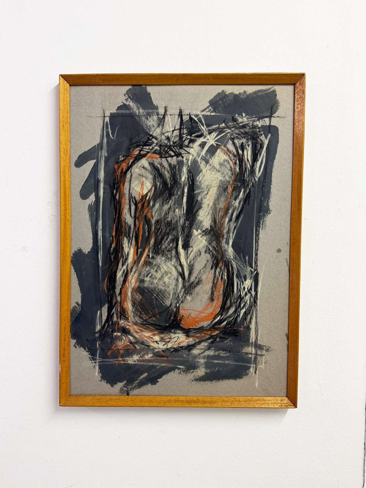 A striking large abstract nude study by Felix Robbins, rendered in expressive charcoal and mixed media. Bold, gestural lines define the seated nude figure, layered with sweeping grey washes and energetic black marks, while subtle accents of burnt orange add warmth and movement.