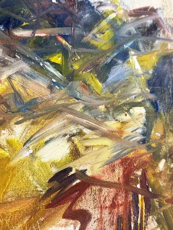 Earthy reds and browns cut through luminous yellows and muted blues, creating a dynamic, shifting composition. Expressive marks and subtle textures reveal the artist’s process, inviting the viewer to explore depth, movement, and rhythm within the surface.