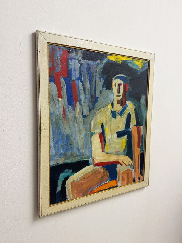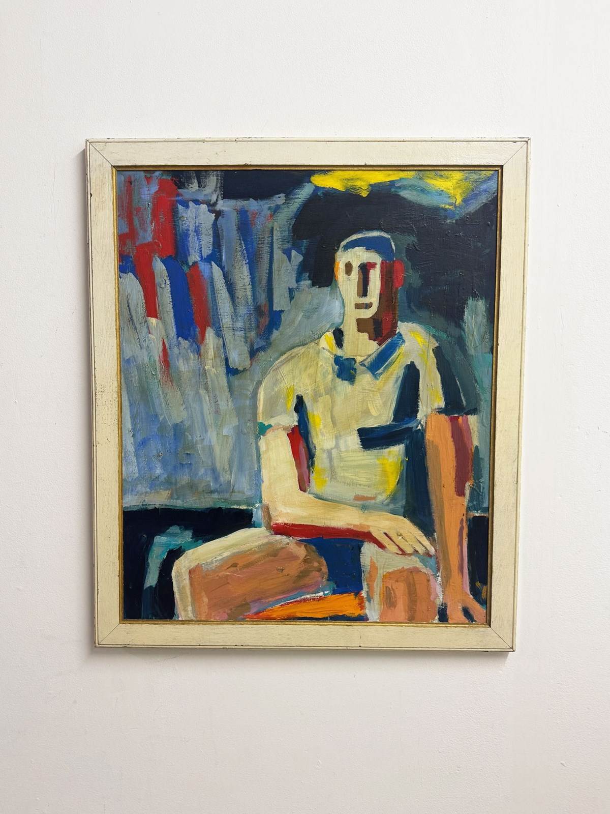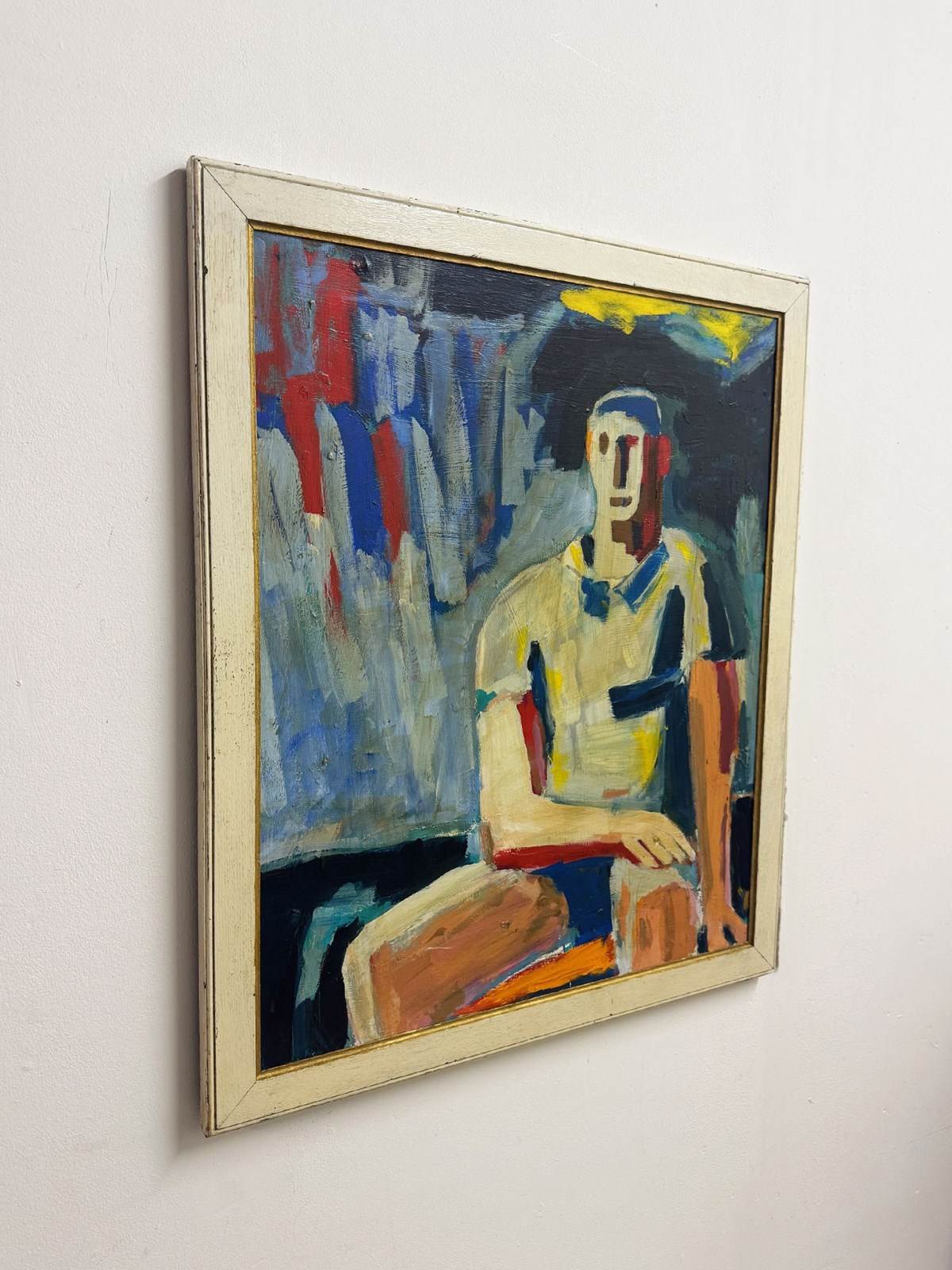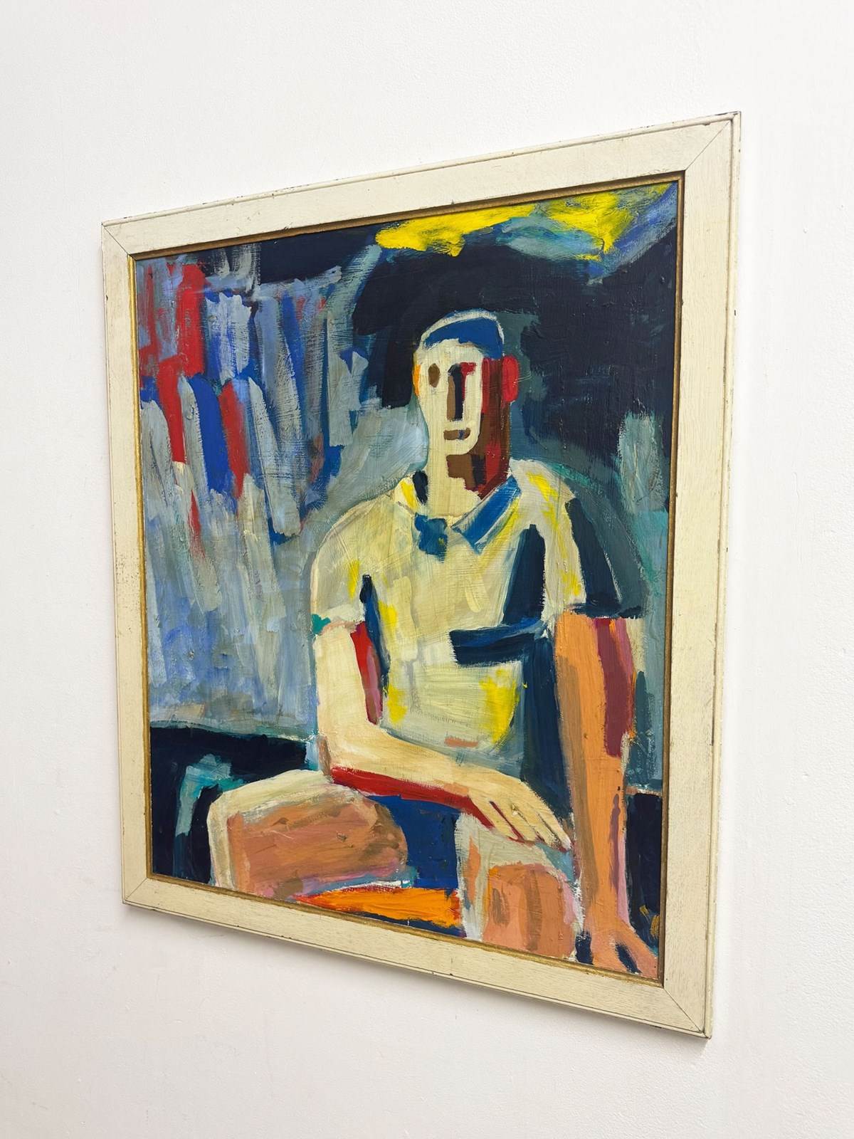Vintage figurative oil painting in the style of David Park, featuring expressive brushwork and bold, gestural colour. The seated figure is rendered in dynamic planes of blue, red and yellow, capturing the spirit of post-war modernist abstraction. A striking Bay Area inspired statement piece, framed and ready to hang.