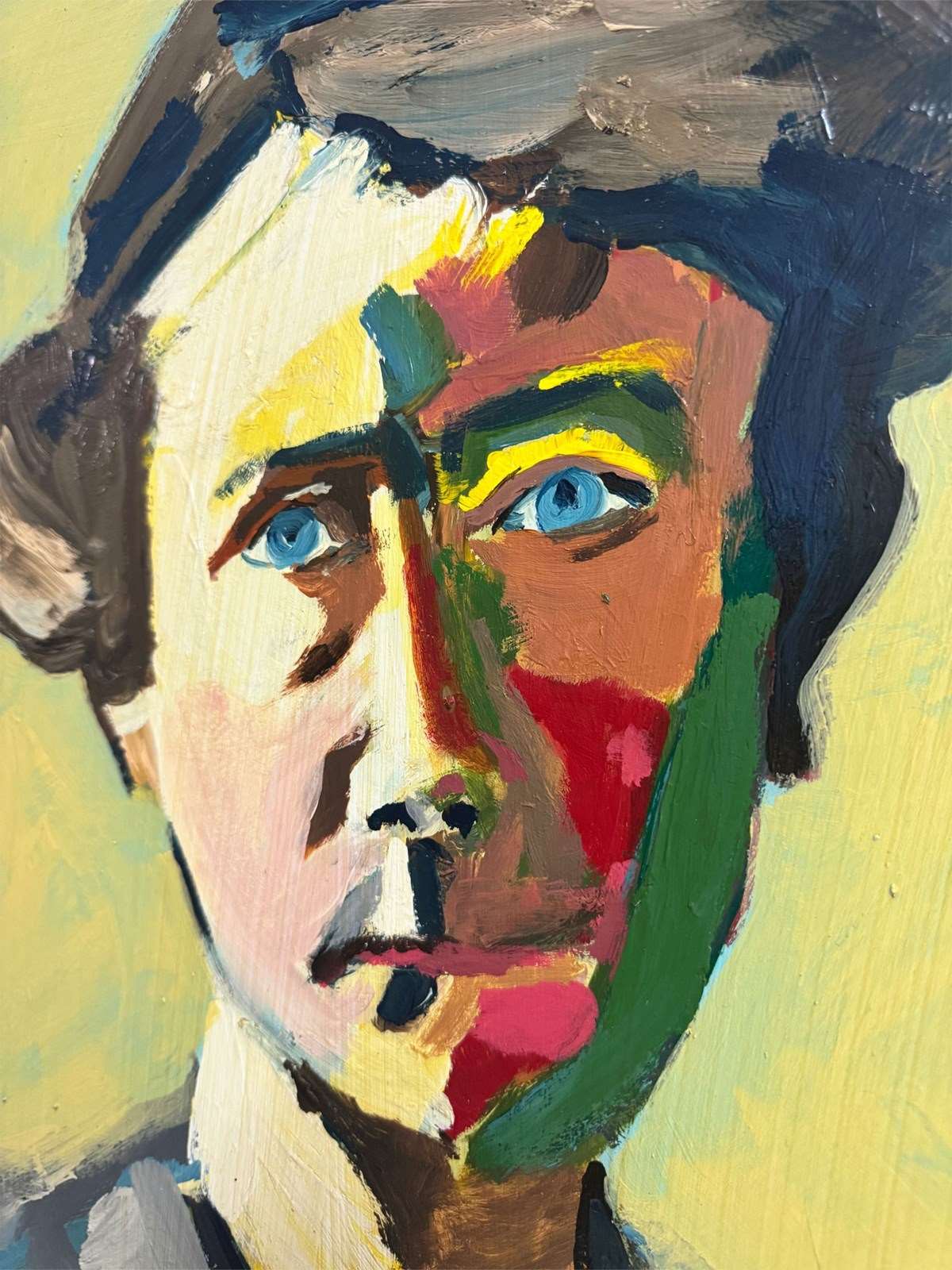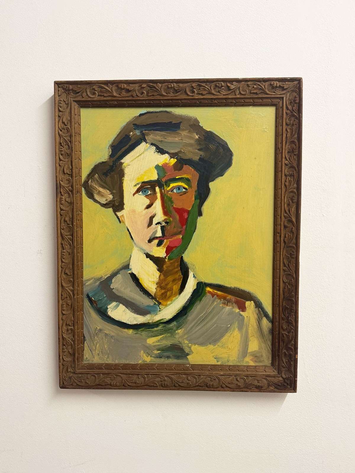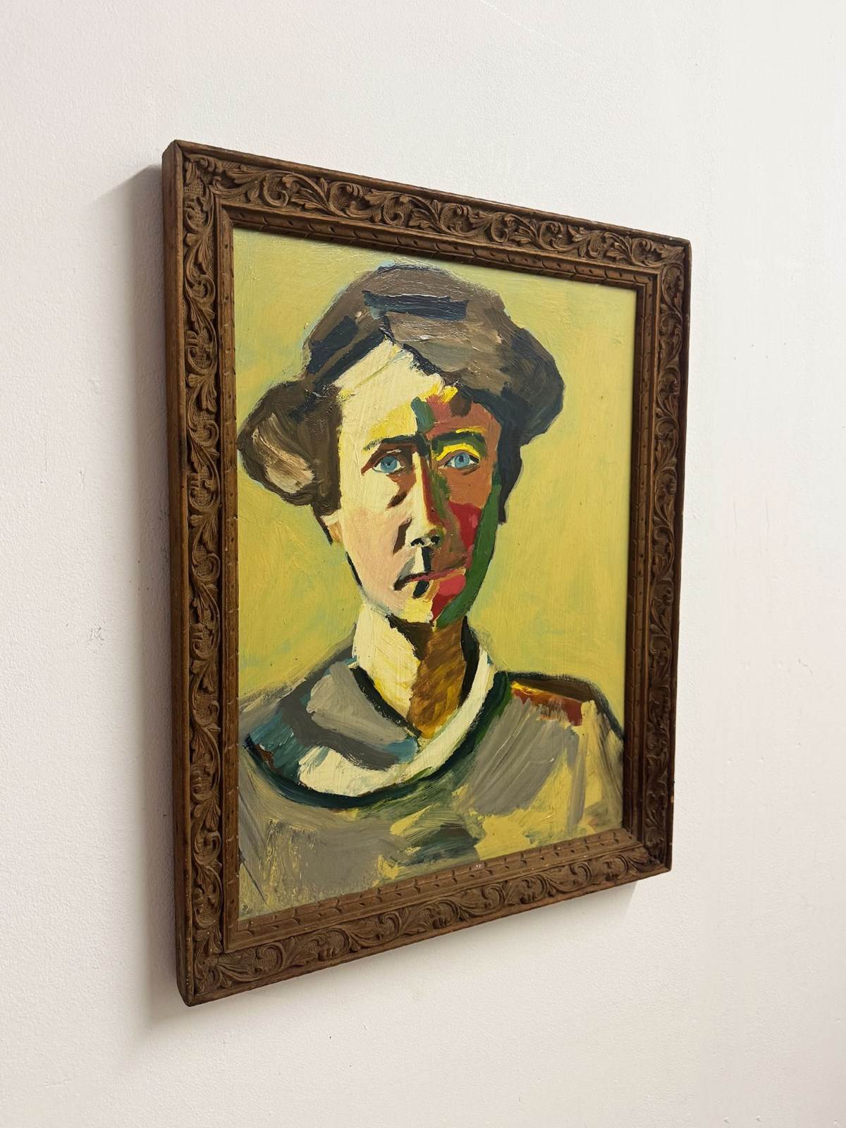 Vintage expressionist portrait in the style of Gabriele Münter, featuring bold colour blocking, expressive brushwork and striking presence. Rich tones of yellow, green and red create dramatic contrast against a warm background, capturing the spirit of early 20th-century German Expressionism.