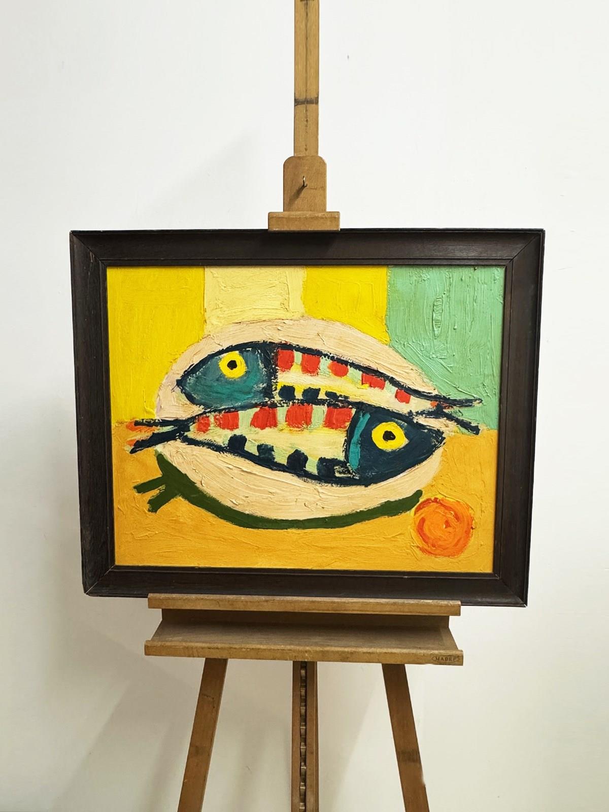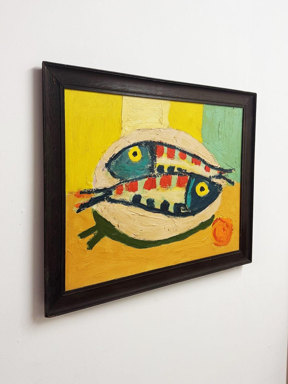 A large textured, well executed painting of two fish set against a calm yellow background. Thick, expressive brushstrokes and layered yellows and greens give the work depth and movement. Framed in a vintage oak frame and arrives ready to hang.