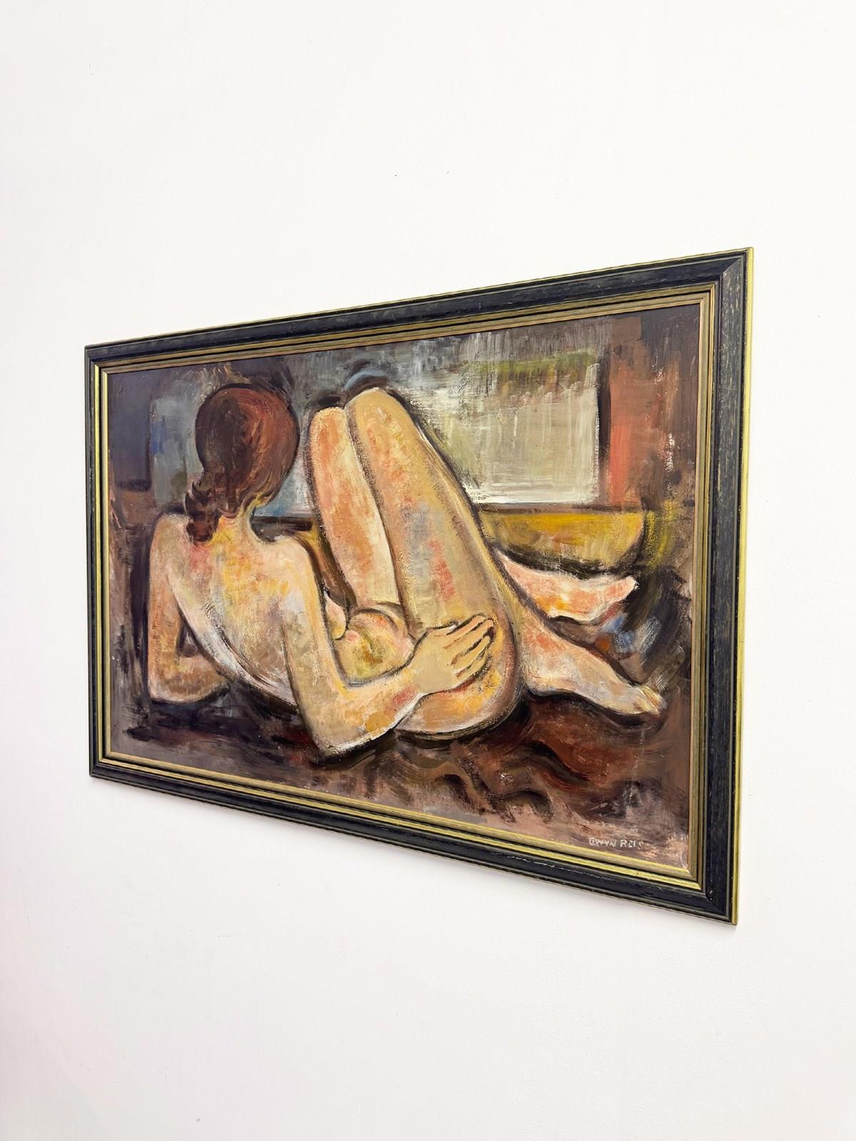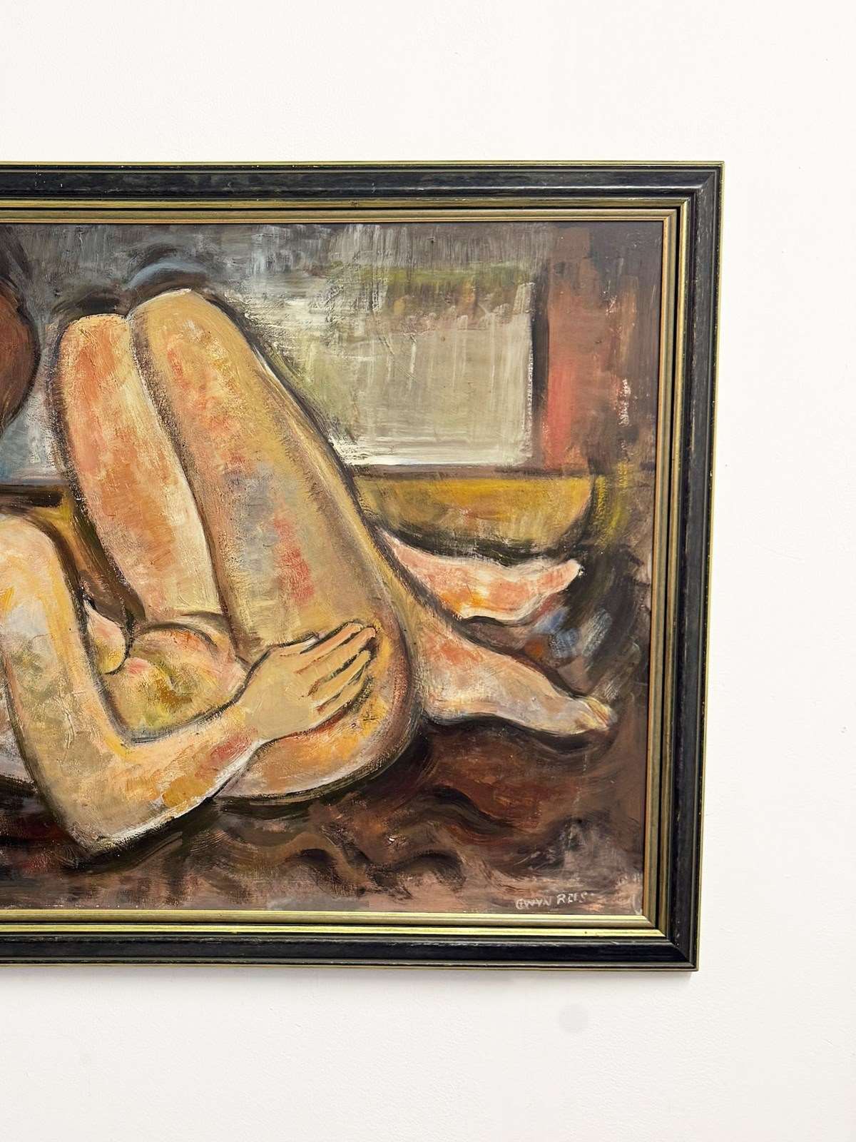 A large striking mid century modern oil painting by Gwyn Rees depicting a reclining nude female in an intimate interior setting. Executed with confident, expressive brushwork. The palette is rich with earthy ochres, warm flesh tones and deep umbers, balanced by cooler greys and muted blues in the background.