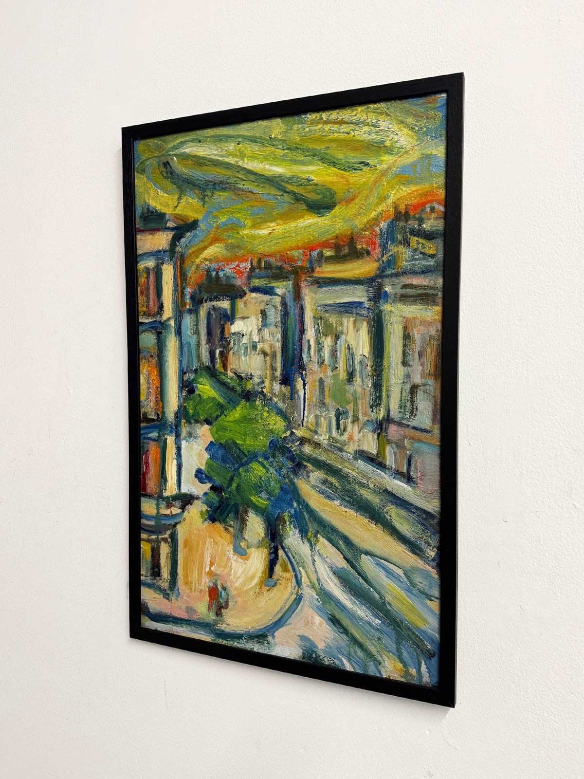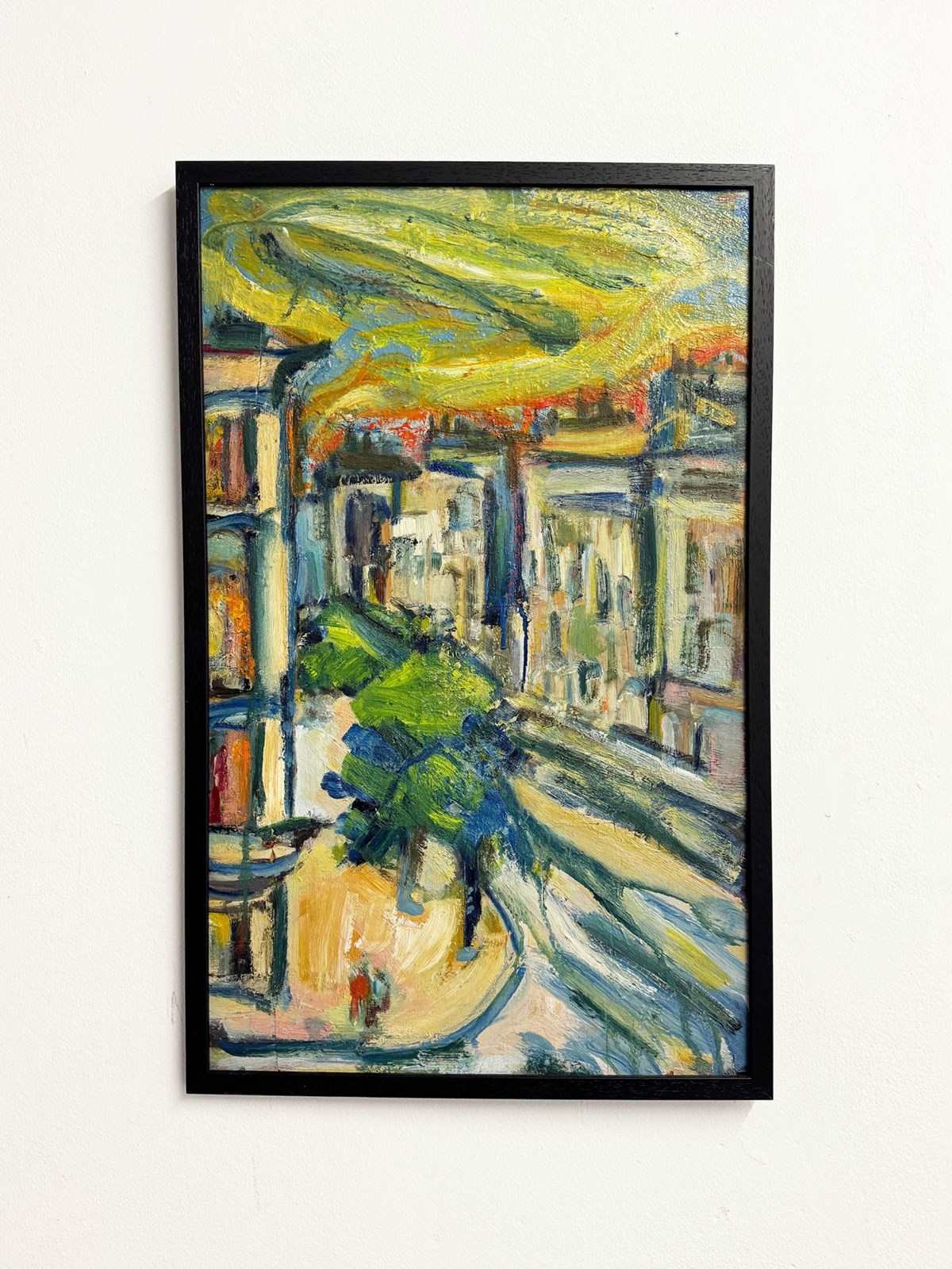 This expressive mid century signed oil painting captures the rhythm and energy of an urban landscape through bold, gestural brushstrokes and layered colour. Sweeping greens, blues, and warm yellows flow across the surface, suggesting movement, light and architecture without strict realism.