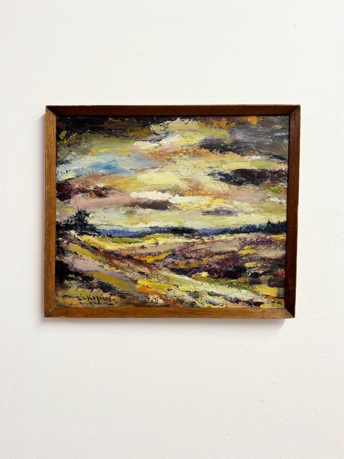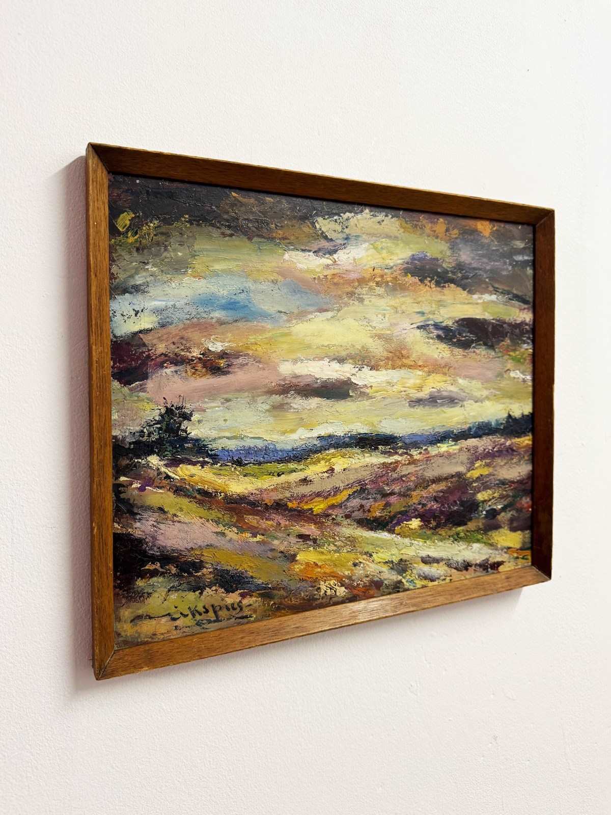Bring warmth and character into your home with this stunning abstract landscape oil painting, featuring expressive brushstrokes and a rich palette of earthy yellows, deep purples, soft blues, and moody grays. The textured layers create movement and depth, capturing the beauty of an ever-changing sky over rolling fields. The work is indistinctly signed lower left.