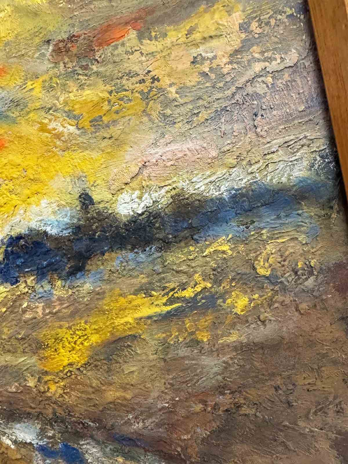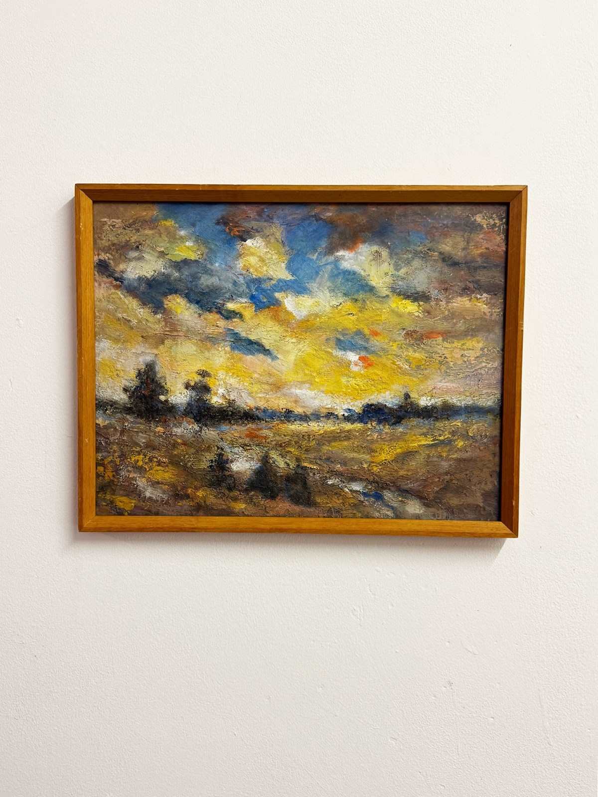 Bring warmth and atmosphere to your home with this expressive mid century landscape oil painting. Featuring dramatic skies of rich yellows, blues, and earthy browns, this textured artwork captures the beauty of nature at sunset. The bold brushstrokes and layered colours create depth and movement, making it a striking focal point for any room.