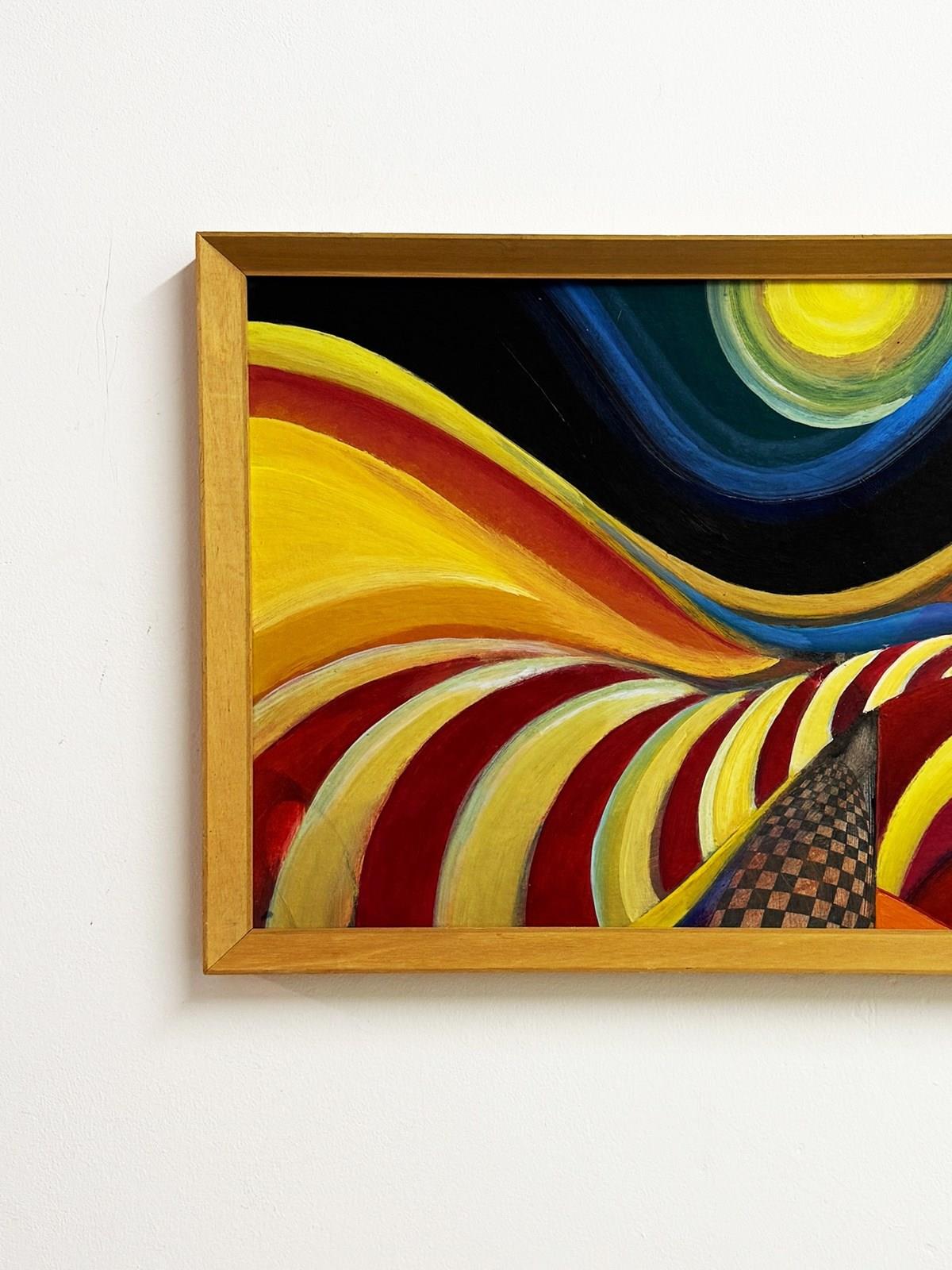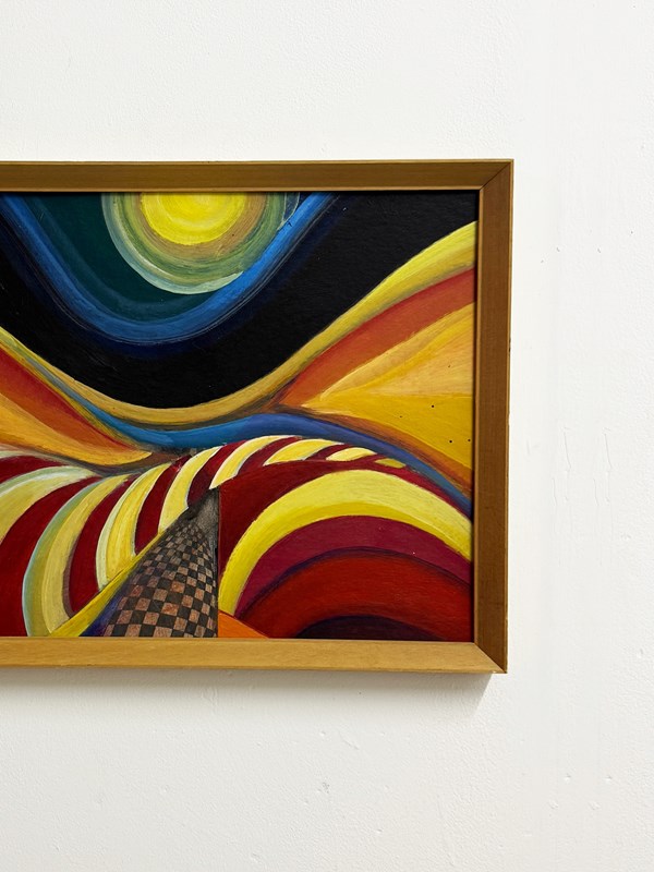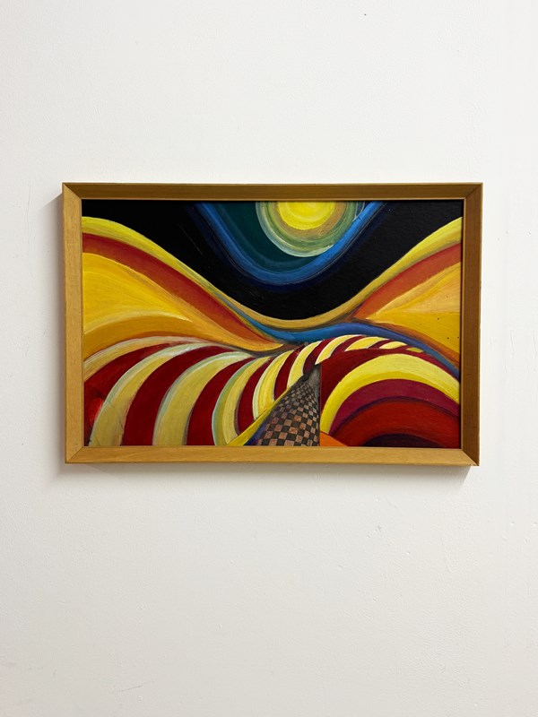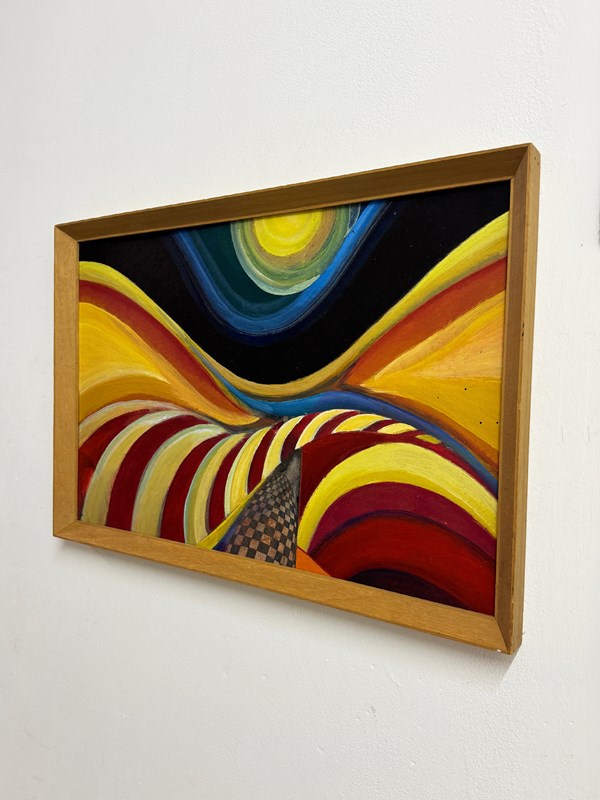 A vibrant and striking vintage abstract modernist painting from the 1960s, capturing the energy and optimism of the mid-century era. The composition features bold, undulating forms in red, yellow, blue, and black, creating a dynamic landscape with rhythmic movement and depth. Presented in a period oak frame, ready to hang.