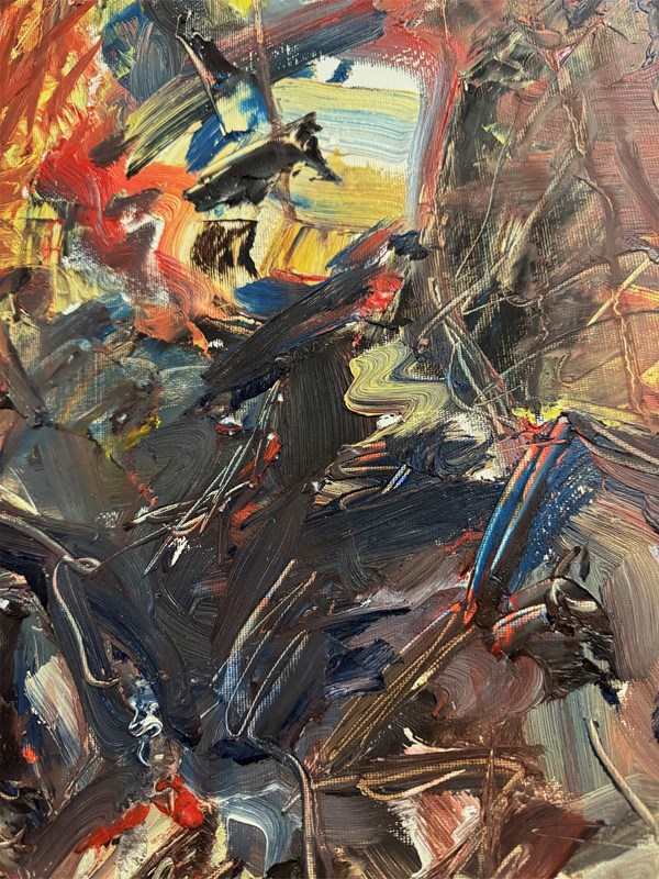 The palette is rich and energetic, combining deep browns and blacks with flashes of red, yellow and blue. These contrasting tones create a sense of rhythm and structure.