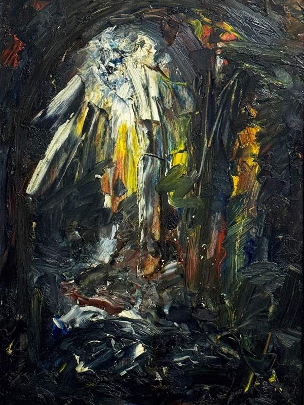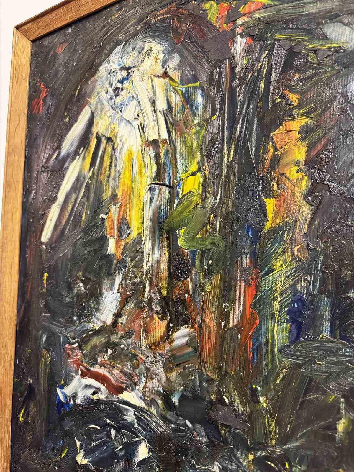 A striking mid-century abstract painting with a heavily worked surface and strong expressive presence. The composition is built around a central vertical form, surrounded by darker gestural passages, creating contrast, depth and a sense of atmosphere.