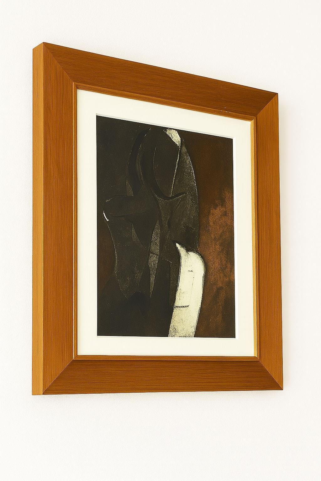 Presented in a warm mid-century style wooden frame with a off-white mount, the artwork is ready to hang and enjoy.
