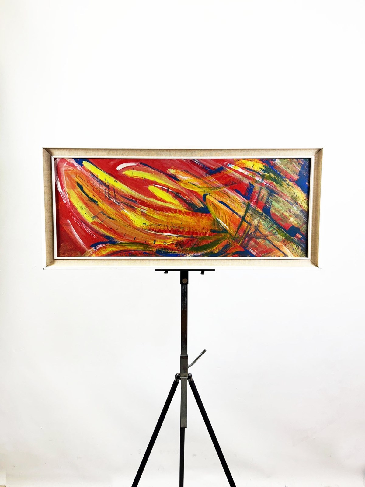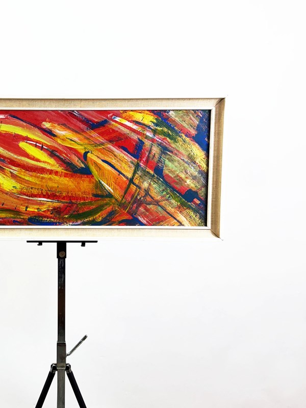 A striking and energetic original painting by British artist Clive A. Deacon, known for his bold use of color and expressive brushwork. This abstract composition radiates movement and intensity through sweeping strokes of red, yellow, orange, and deep blue, layered with dynamic texture and rhythm. Signed on the reverse, behind the back-board.