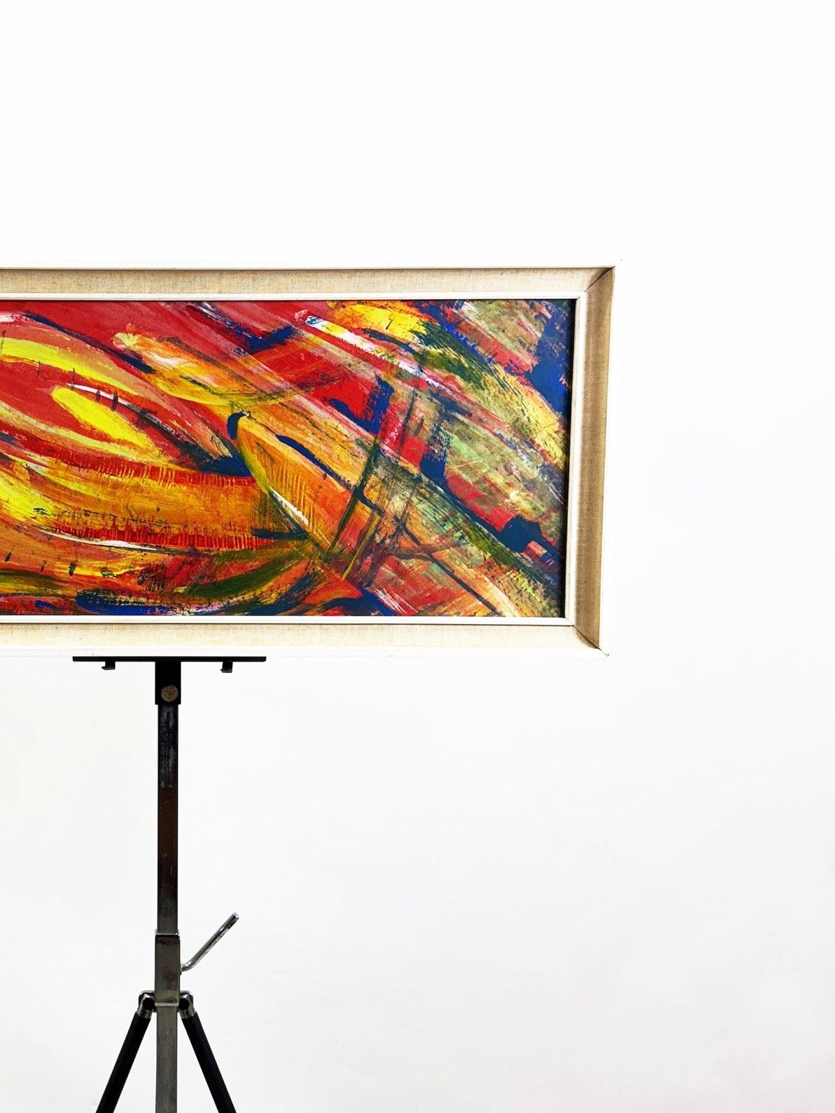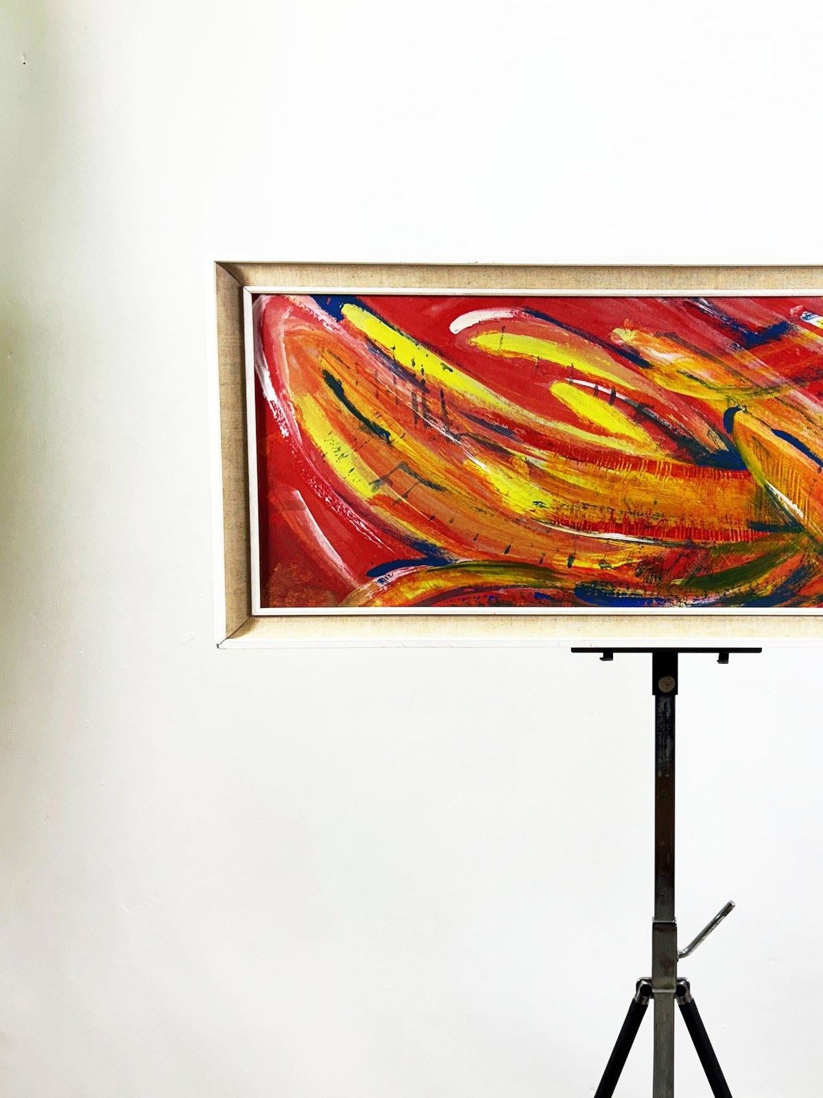 Housed in a classic mid-century linen and wood frame, the artwork is beautifully preserved behind glass and ready to hang. The frame's clean lines and neutral tones offer the perfect contrast to the vibrant brush strokes within, making it a striking focal point in both modern and vintage-inspired interiors.