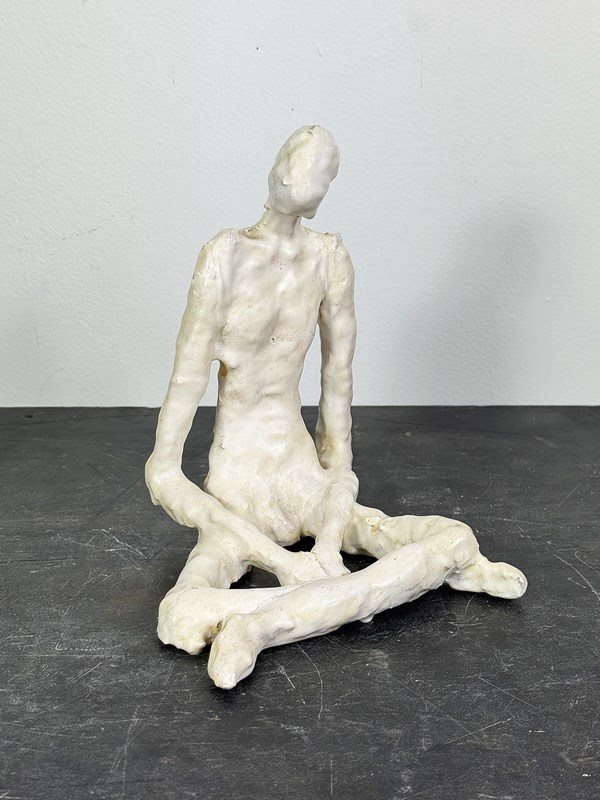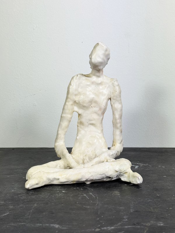 A minimalist, hand-sculpted seated figure made from clay and finished with a smooth white glaze. The elongated form and subtly textured surface reveal the artist’s hand, giving the piece a quiet, contemplative presence.