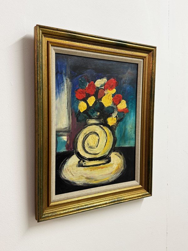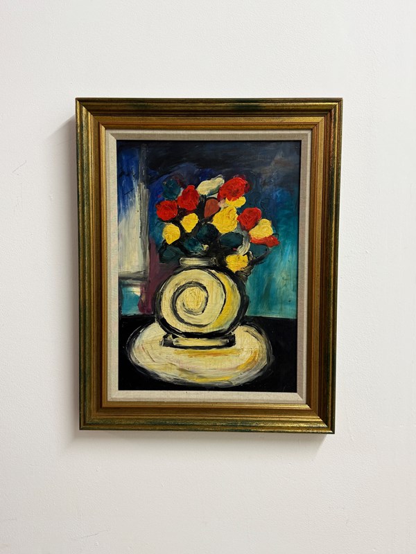 Mid Century Abstract Still Life Oil Painting, Vase Of Flowers