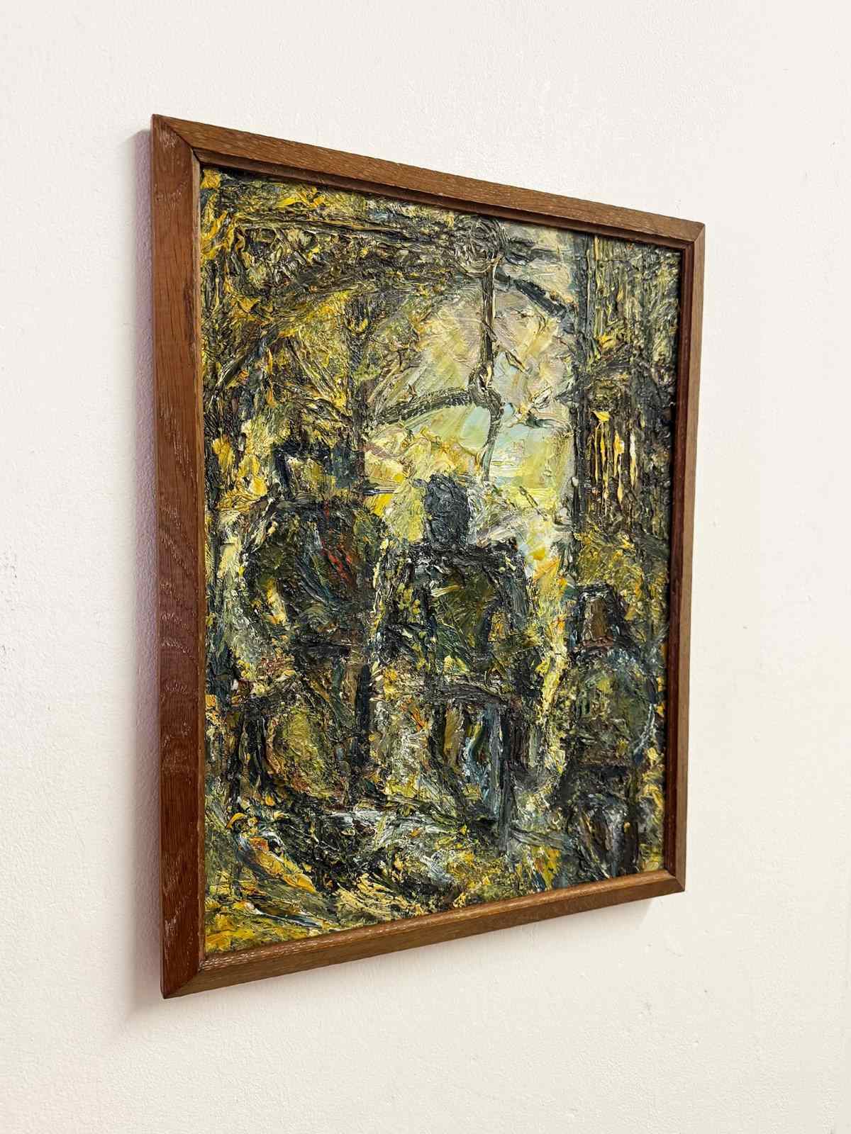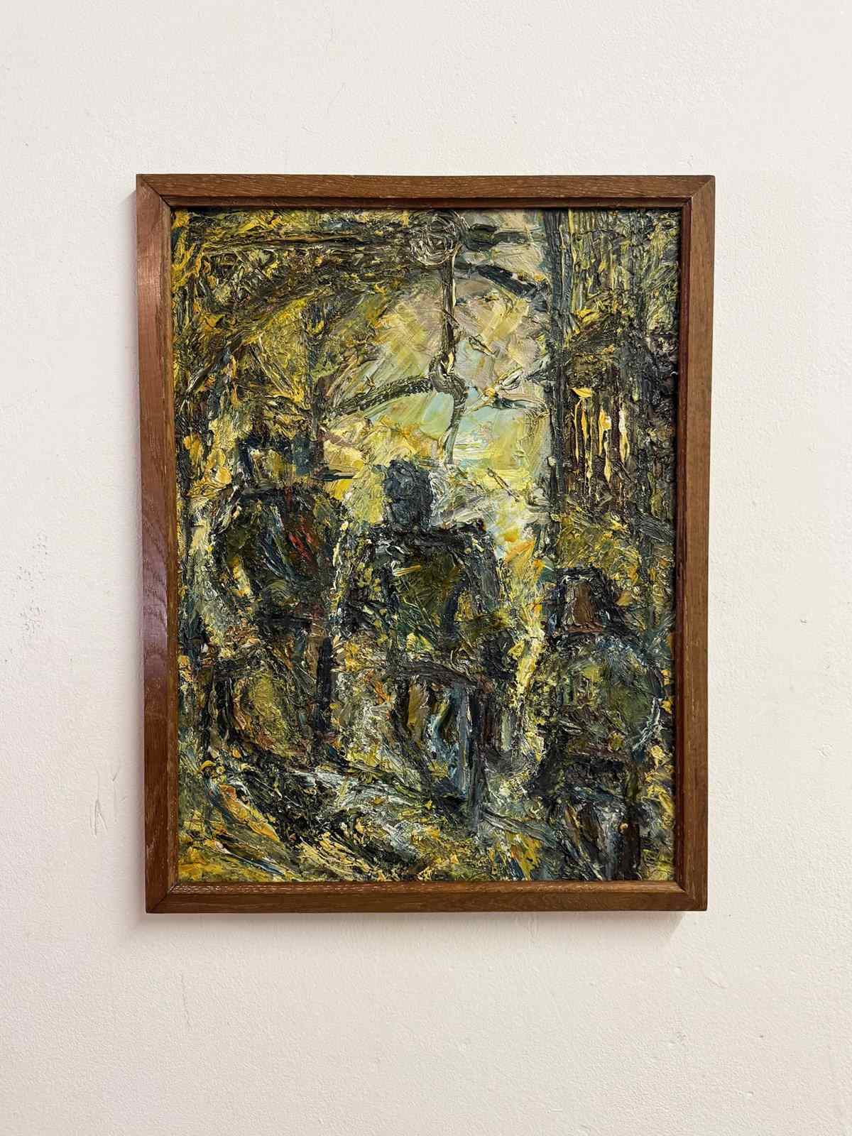 The palette is centred around earthy greens, ochres and deep charcoal tones, with lighter passages adding contrast and energy. A strong and decorative example of 20th century abstract artwork, offering texture, depth and visual interest. Presented in its original wooden frame and ready to hang.