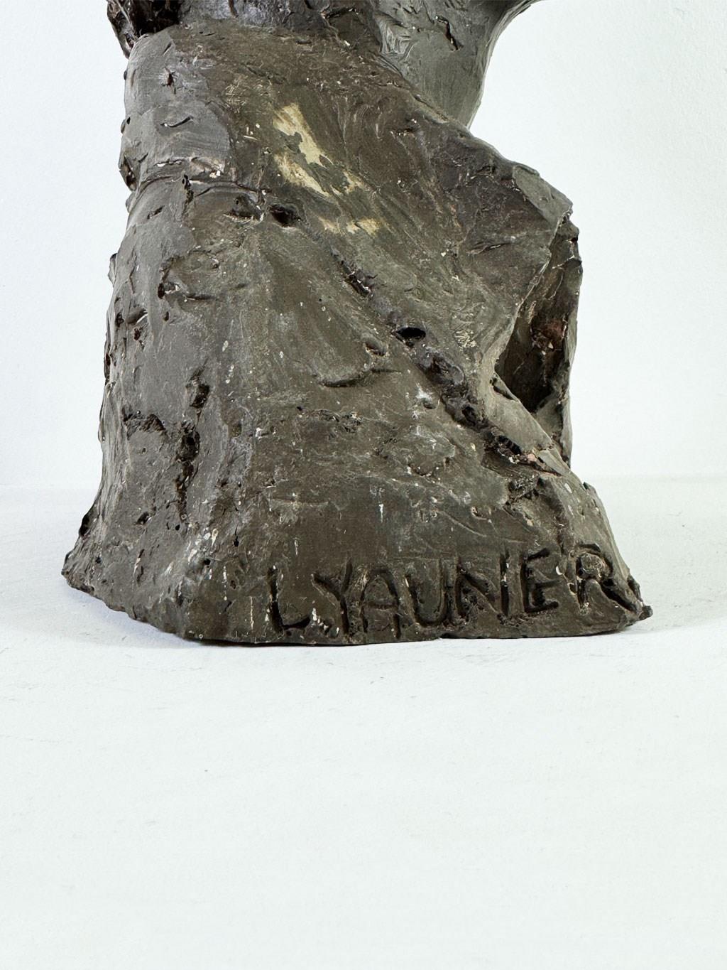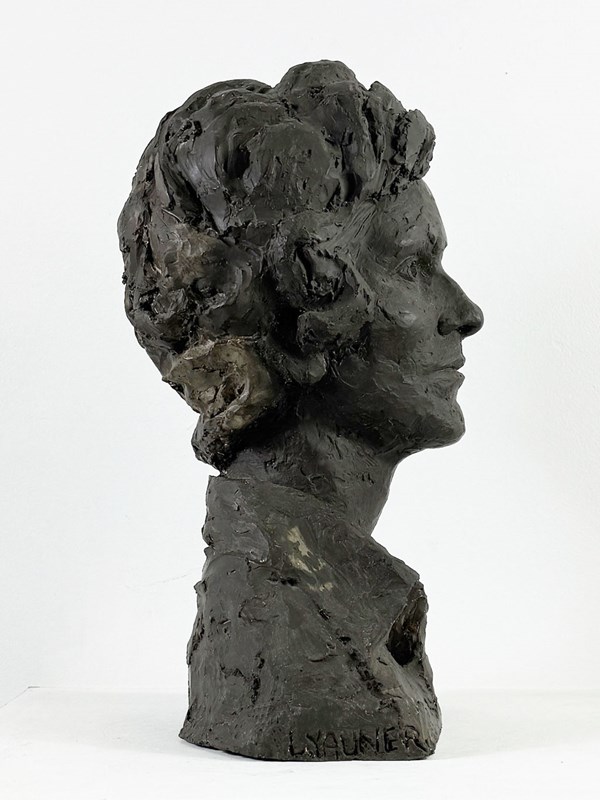 This handcrafted mid century life size bust sculpture, is a striking work of art that captures timeless expression and character, signed L. Yauner. Made from durable fiberglass, it is meticulously finished to look like hand-molded clay, offering the visual richness of traditional sculpture with the strength and longevity of modern materials.