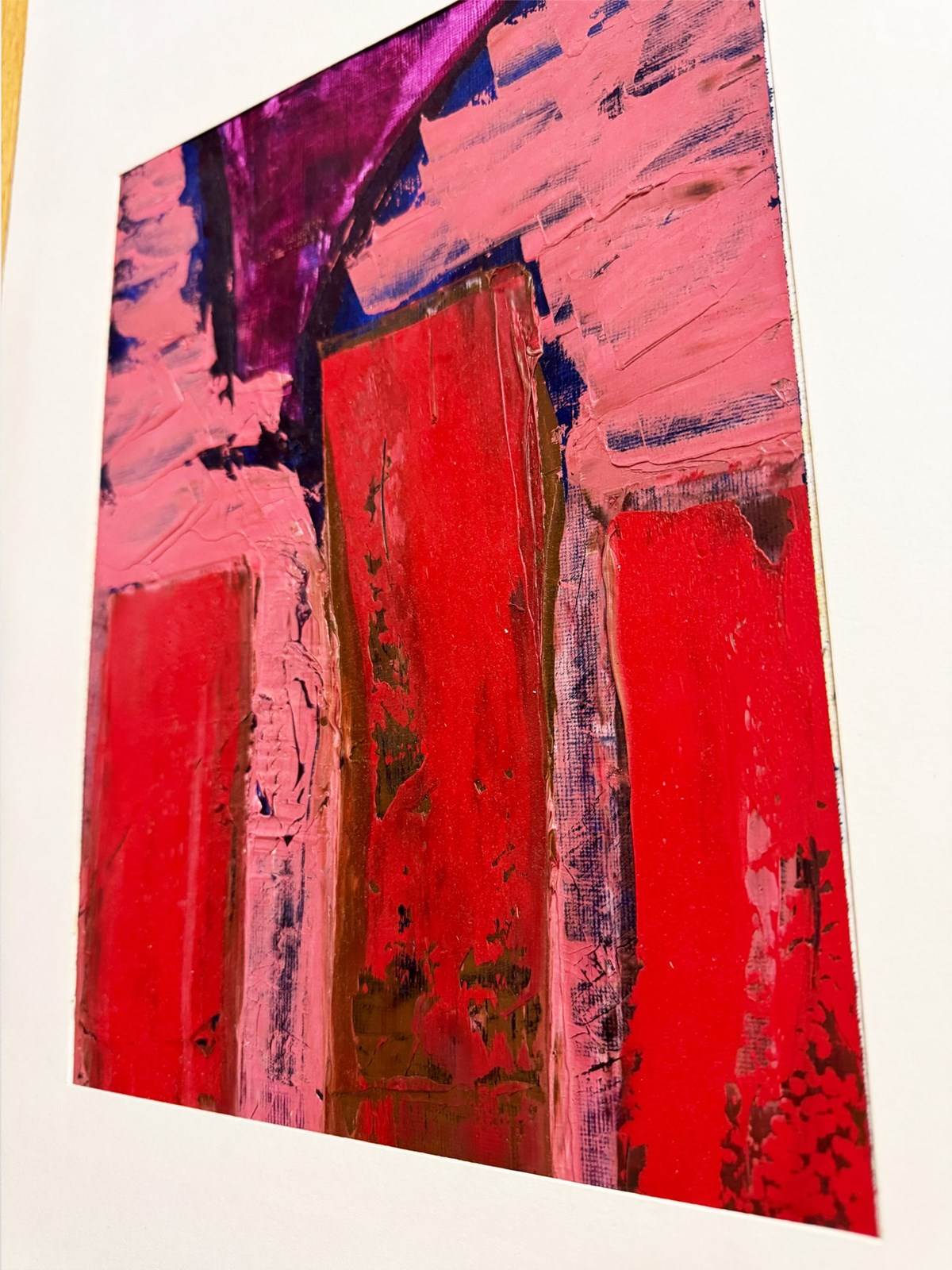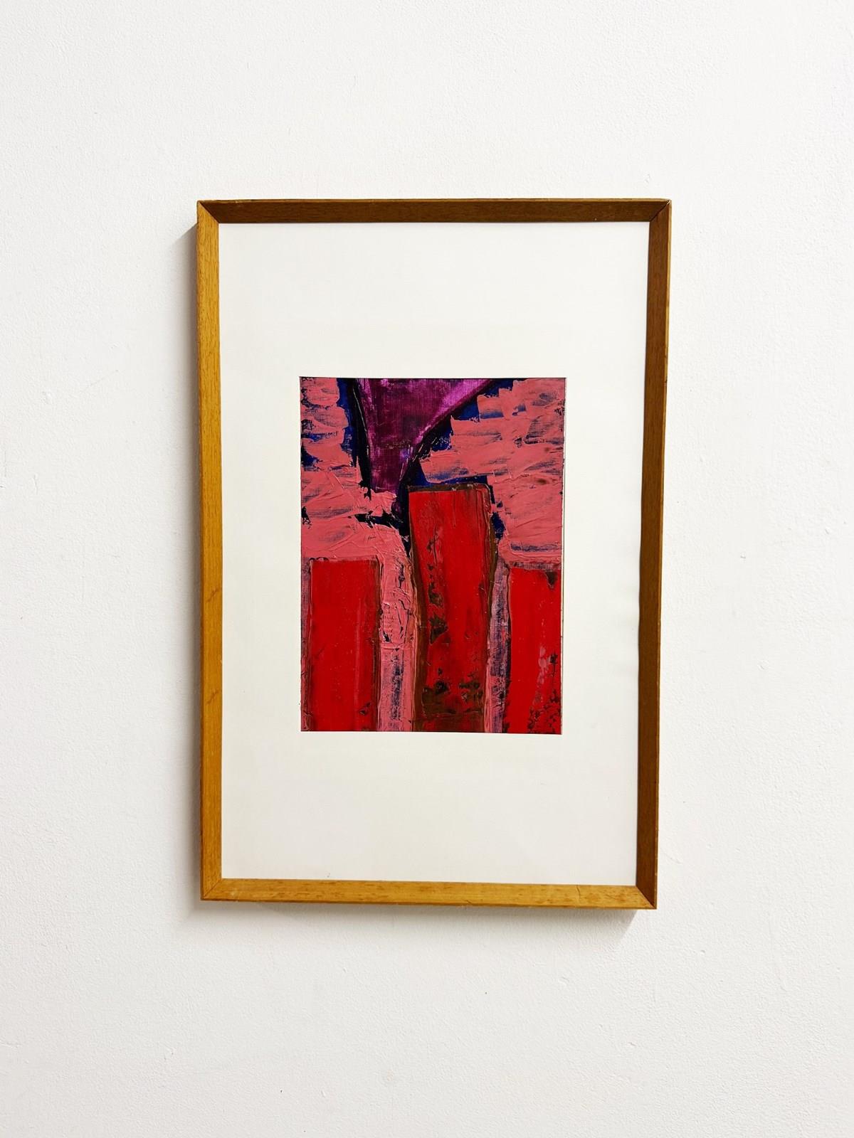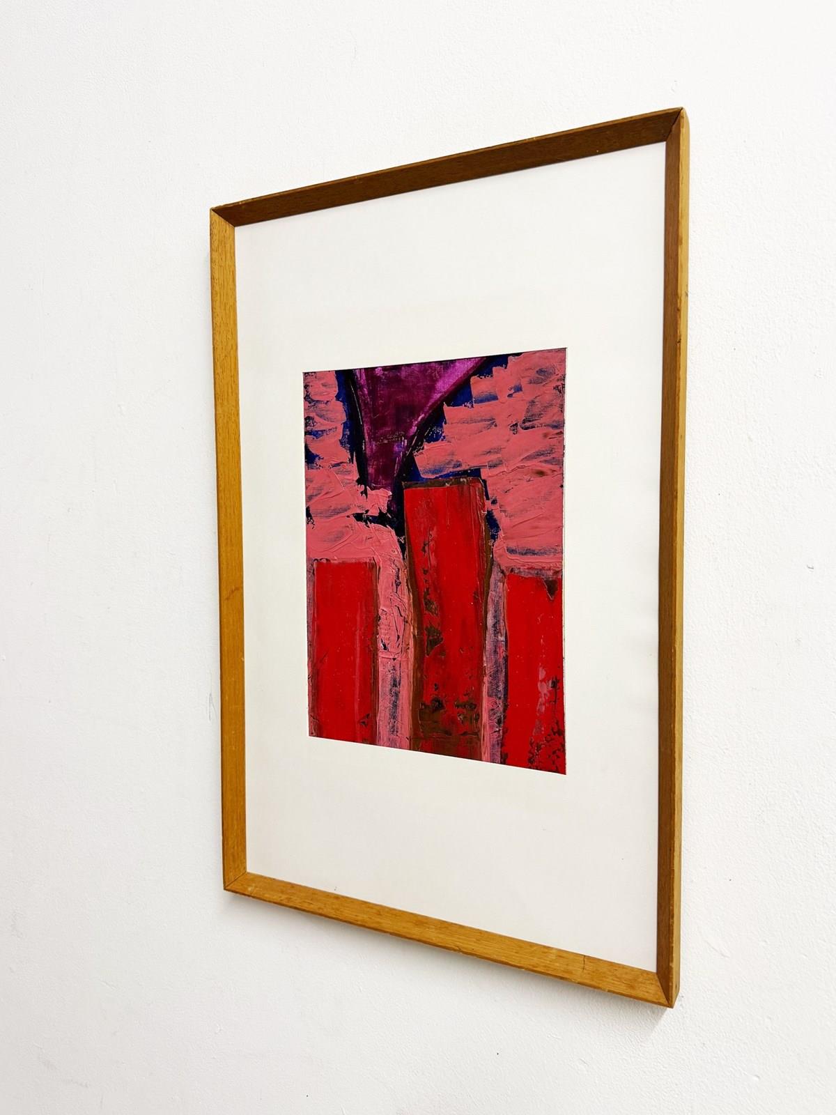 An abstract painting with bold red forms and expressive textured brushwork. Framed in a mid century solid oak wedged frame and matted, it adds warmth, depth and a striking modern statement to any interior.