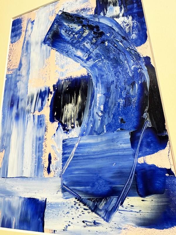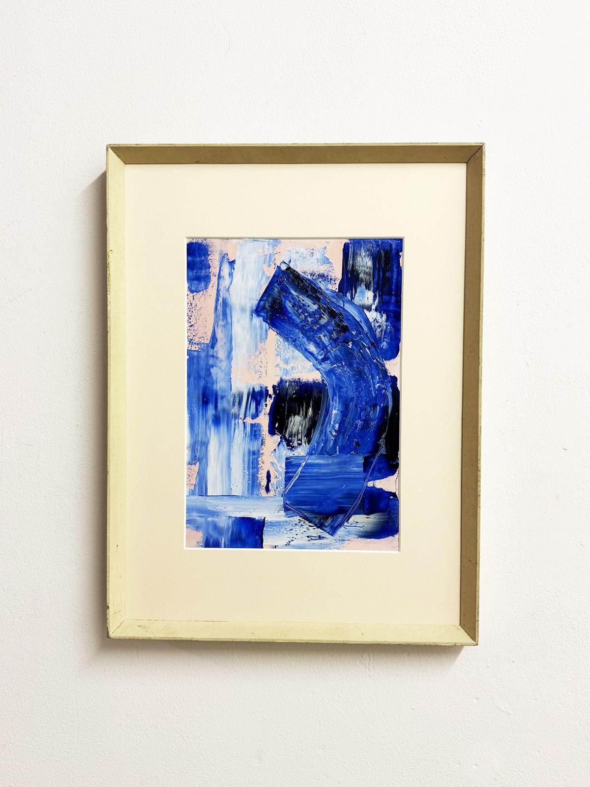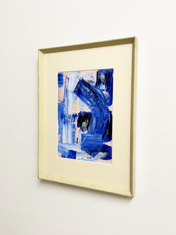 An abstract painting featuring expressive blue brushstrokes, textured and layered in soft neutral tones. Framed in a mid century wedged frame and matted, it brings a calm yet dynamic modern accent to any space. Arrives ready to hang.
