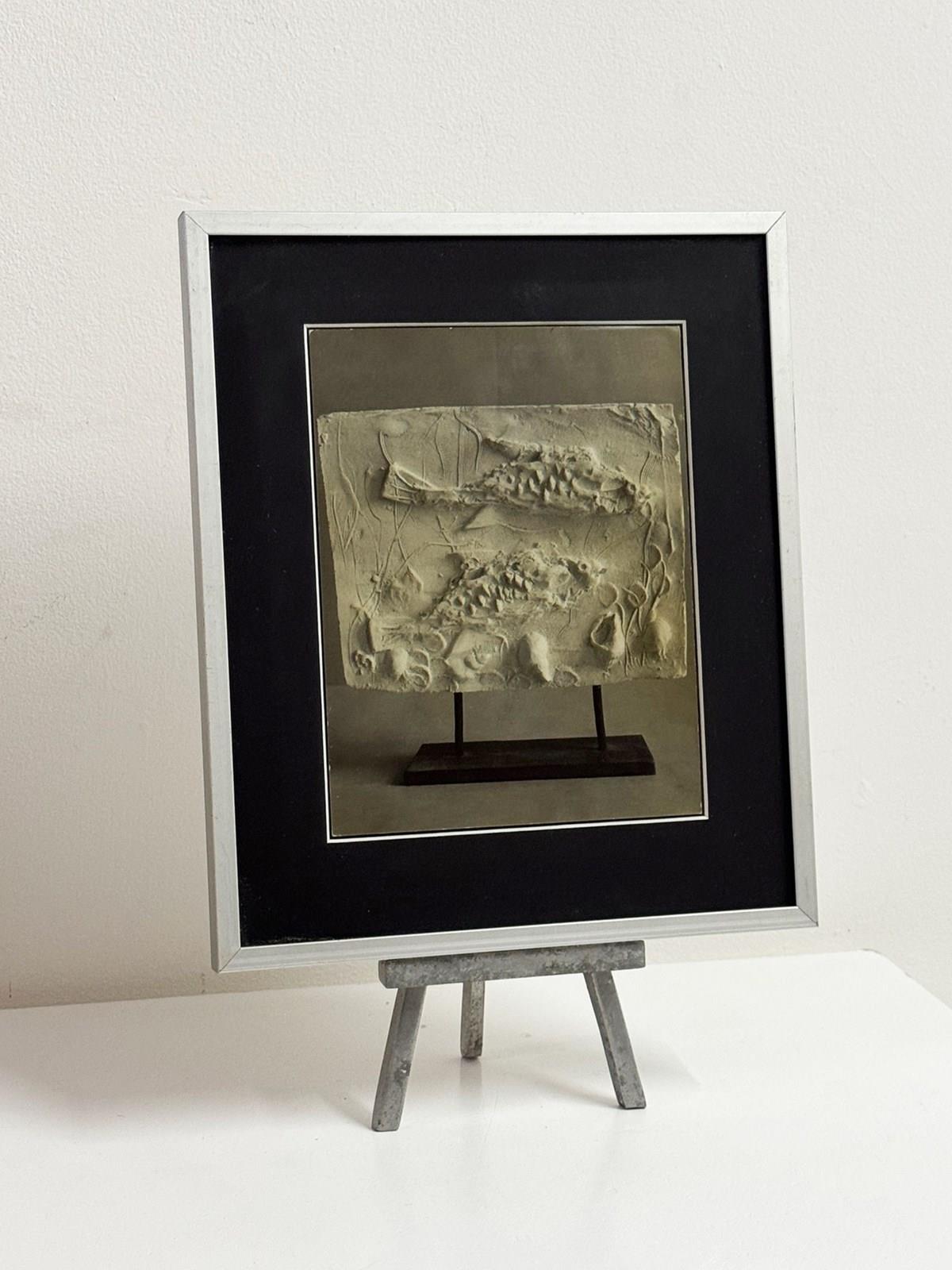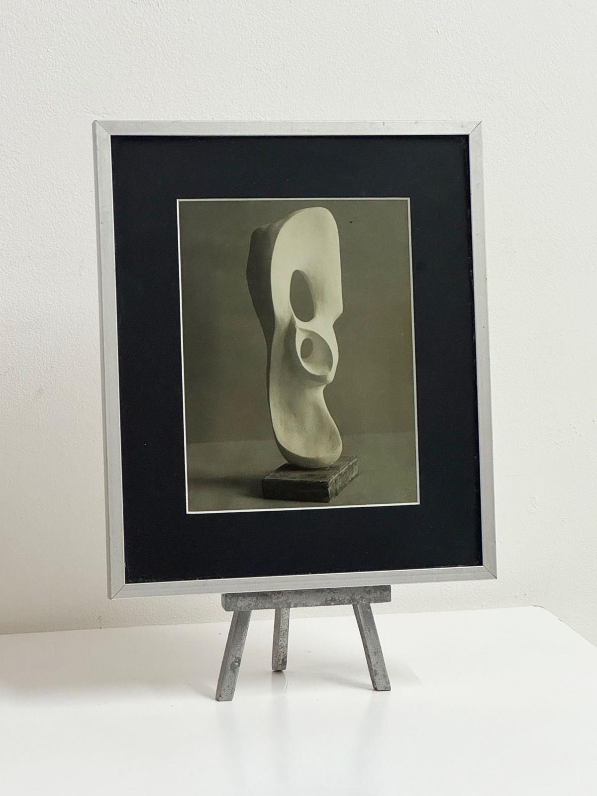 A set of three mid century modernist black & white photos, each depicting sculptural forms in a studio setting. These striking images showcase abstract, organic and textured sculptures. Each photo is mounted in a black mat and set inside a simple silver metal frame, giving them a clean, minimalist look. Three vintage near matching silver frames, ready to hang.