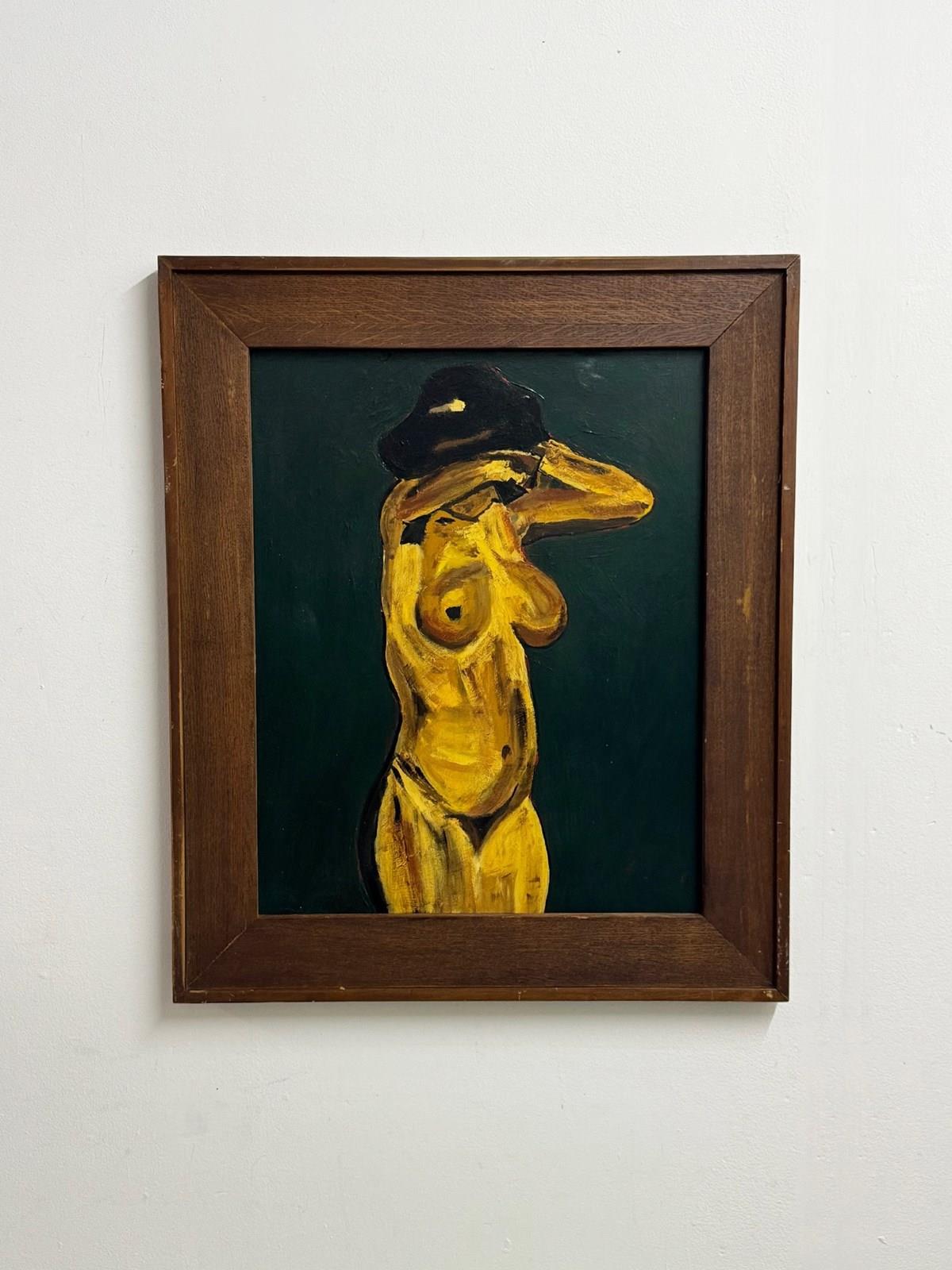 The use of warm ochre and golden tones against a deep green ground gives the composition a rich tonal contrast, while the loose, gestural handling of paint lends the work an almost sculptural presence. The figure is simplified yet powerful, echoing elements of expressionist and modernist figure painting.