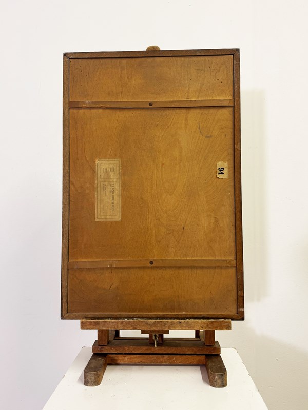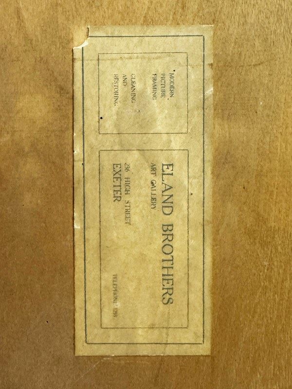 Verso retains a gallery label for Eland Brothers Art Gallery, Exeter. Presented in a simple period solid oak frame that complements the monochrome palette.