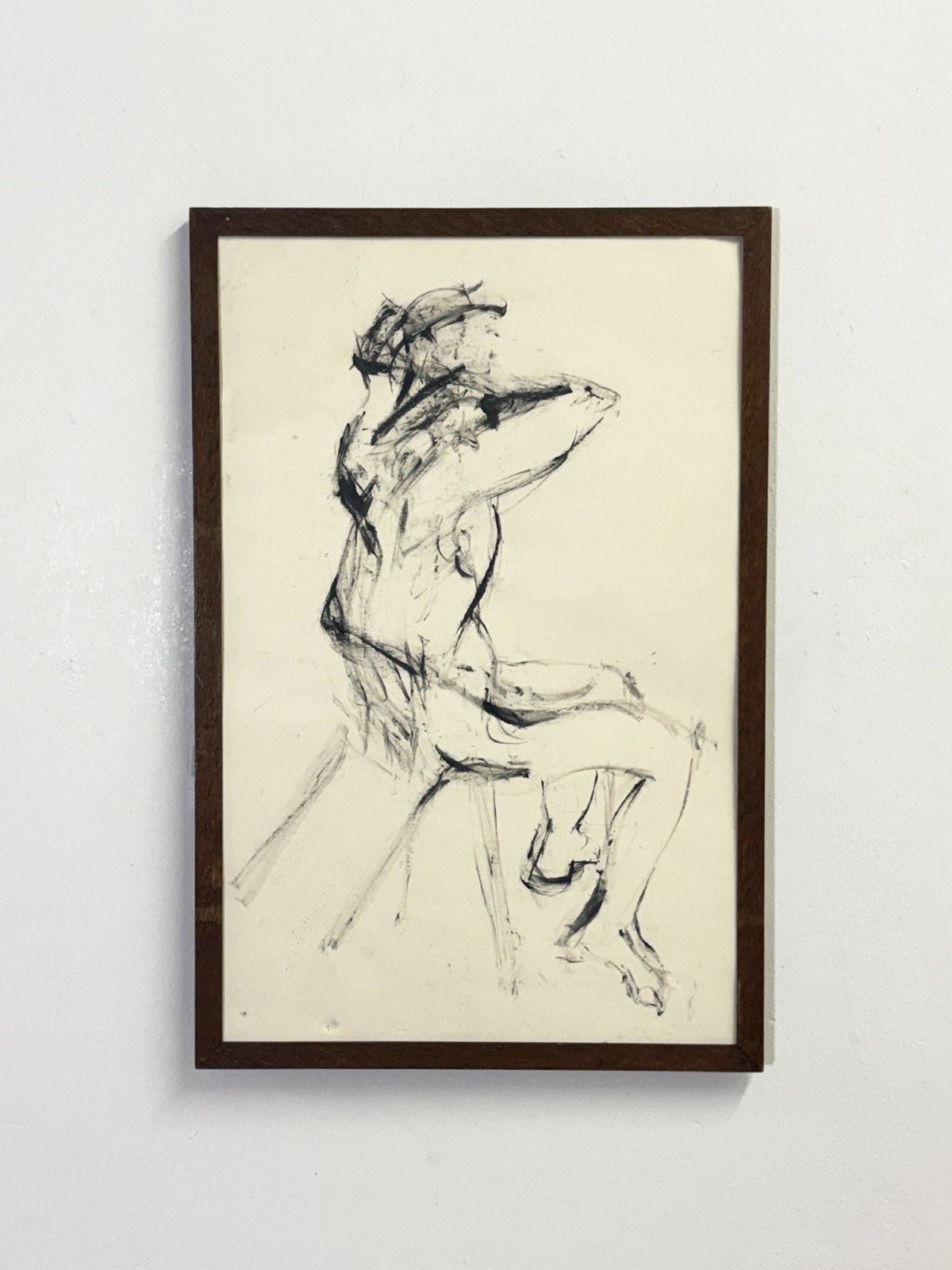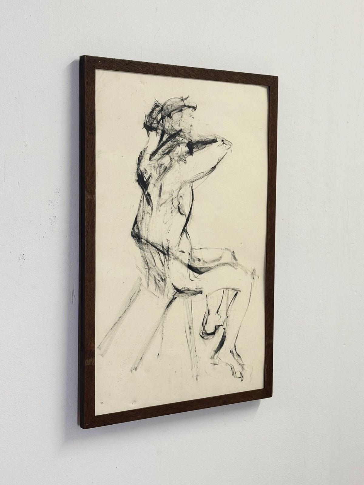 A striking mid century life drawing depicting a seated female nude, executed in expressive black ink. The figure is captured in a relaxed pose, with loose, confident lines that convey both movement and form.