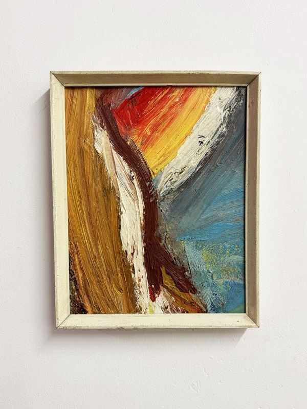 A striking mid-20th century Swedish abstract impasto oil on board. The artist employs a heavy, layered application of paint to create a richly textured, tactile surface full of depth and movement. Presented in its original period off-white painted wedged frame, complementing the bold surface and authentic mid-century character. W: 28.5 x D: 2.5 x H: 35 cm