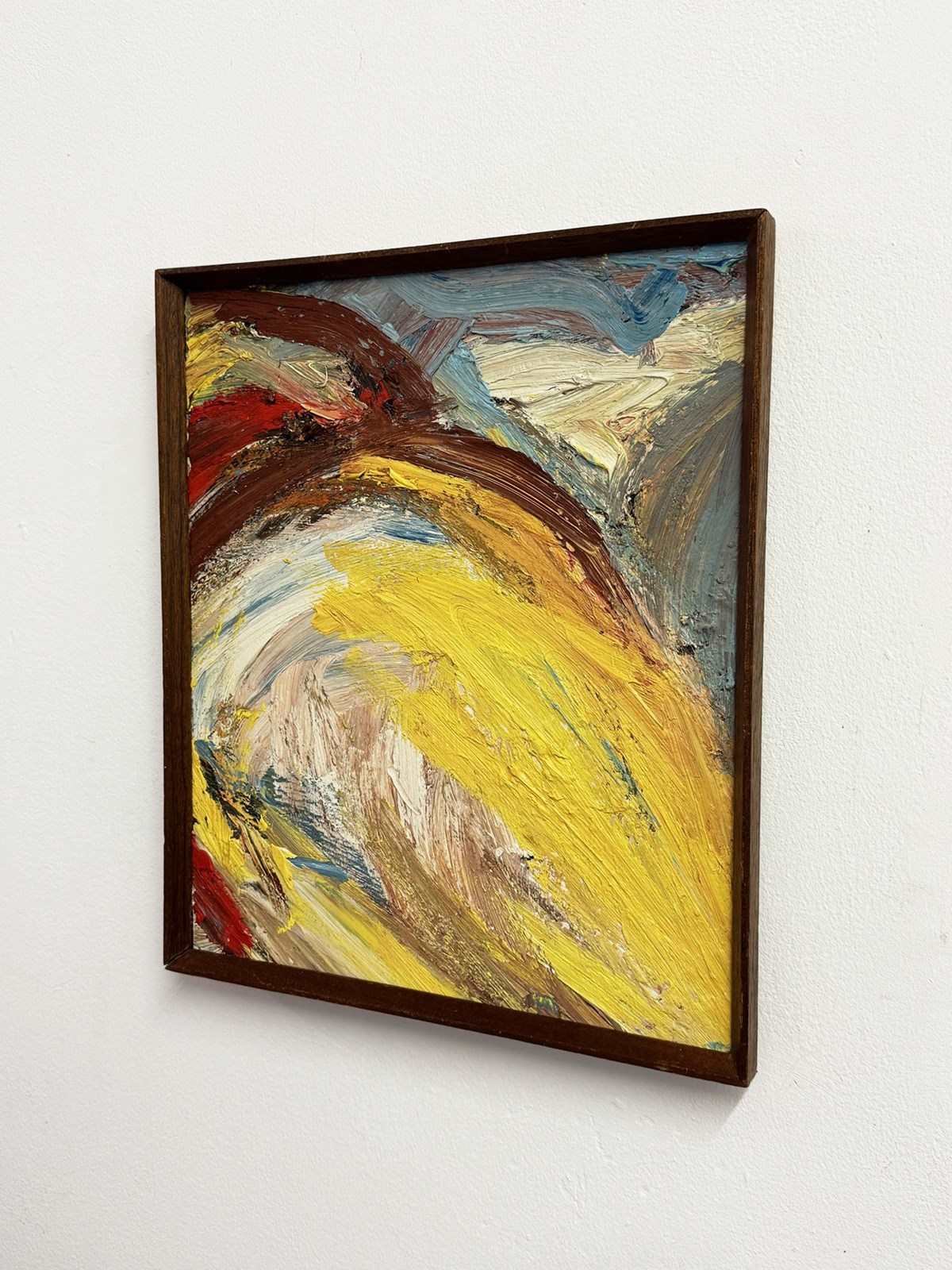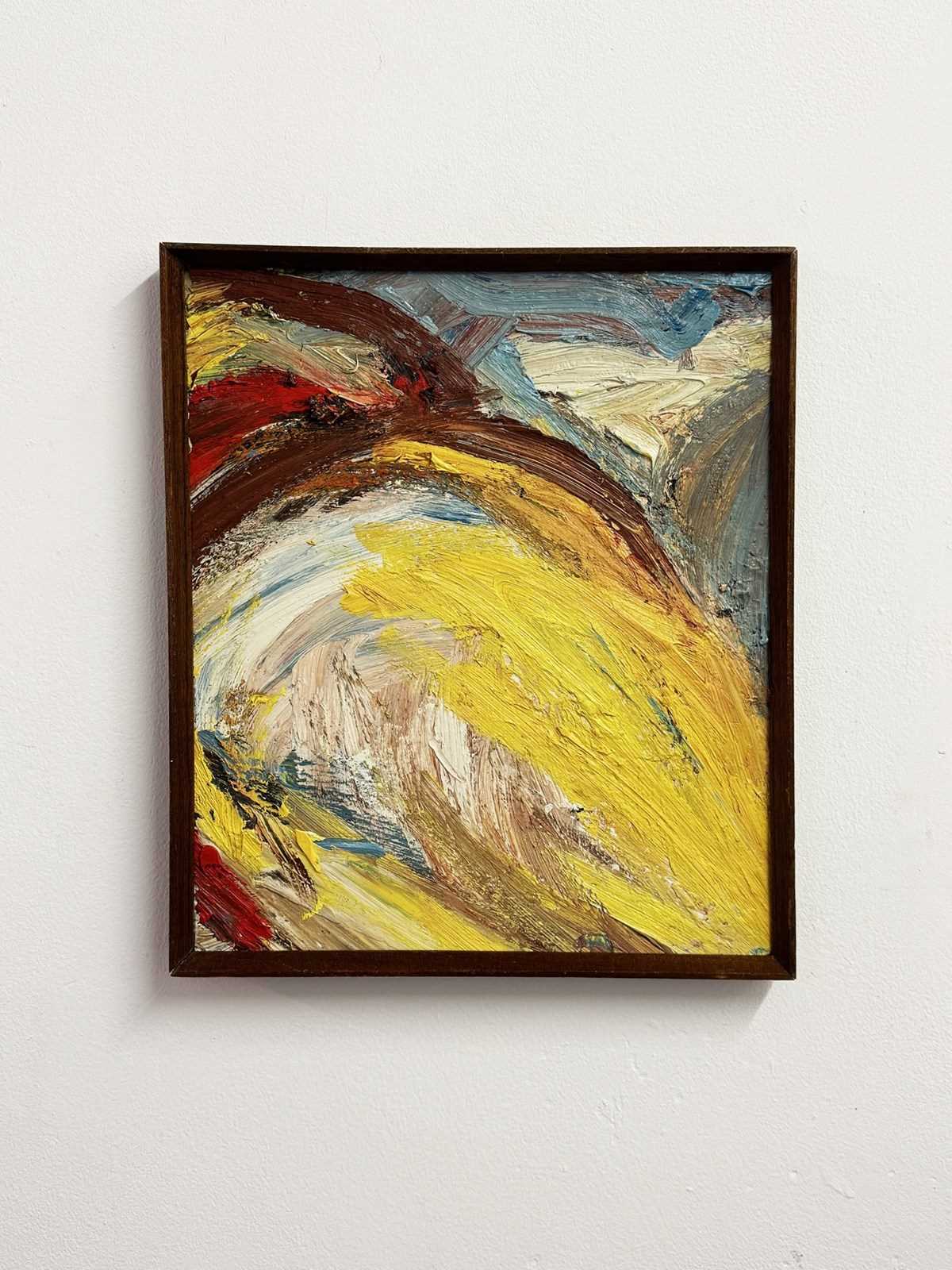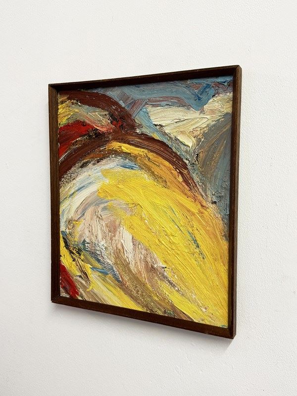 A striking mid-20th century Swedish abstract impasto oil on board. The artist employs a heavy, layered application of paint to create a richly textured, tactile surface full of depth and movement. Presented in its original period oak wedged frame, which complements the bold surface and authentic mid-century character. W: 32 x D: 2 x H: 37 cm