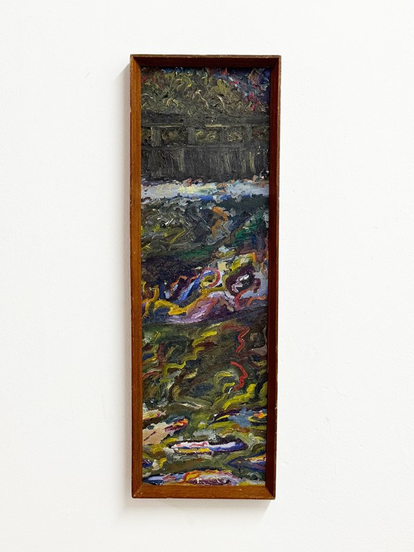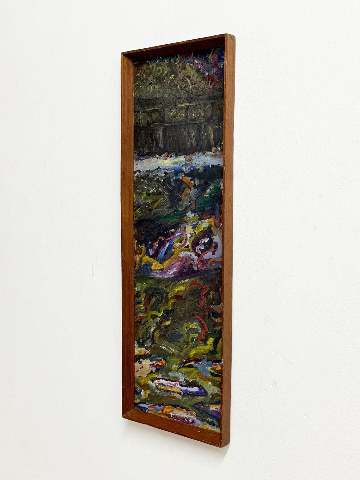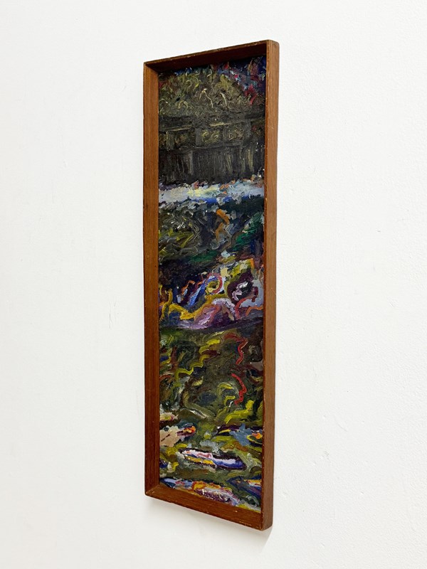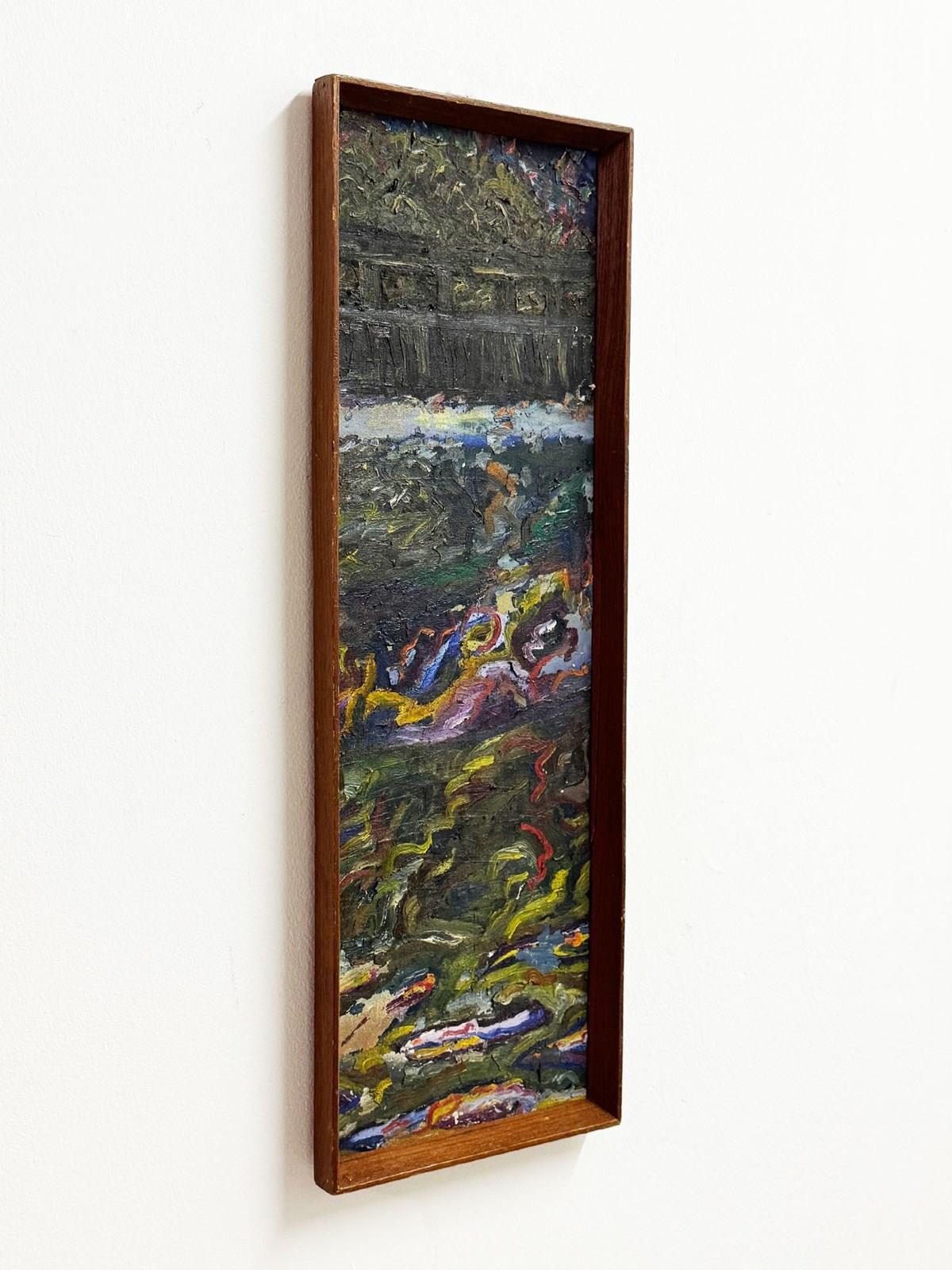 Swedish mid-century oil painting. Features expressive brushwork, rich layered texture and an abstract landscape impression in deep, earthy tones with vibrant accents. Presented in a period, solid oak wedged frame. Arrives ready to hang.