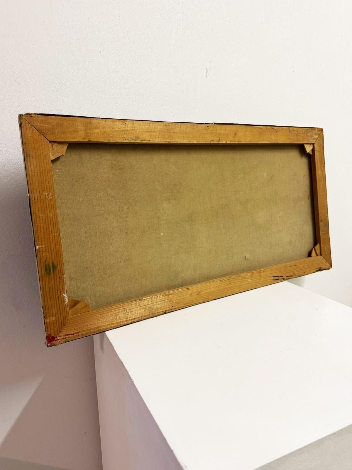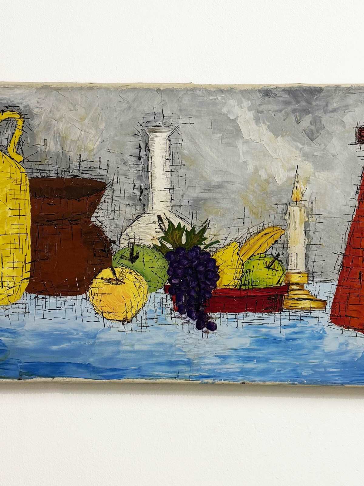 This mid century still life artwork features a bold arrangement of bottles and fruit arranged on a vivid blue tabletop. Painted with confident brushwork and textured layers in a European modernist style. The artist creates depth and energy through bold colour contrasts. Dynamic cross-hatched lines and geometric cubist forms give the piece a striking mid century aesthetic.