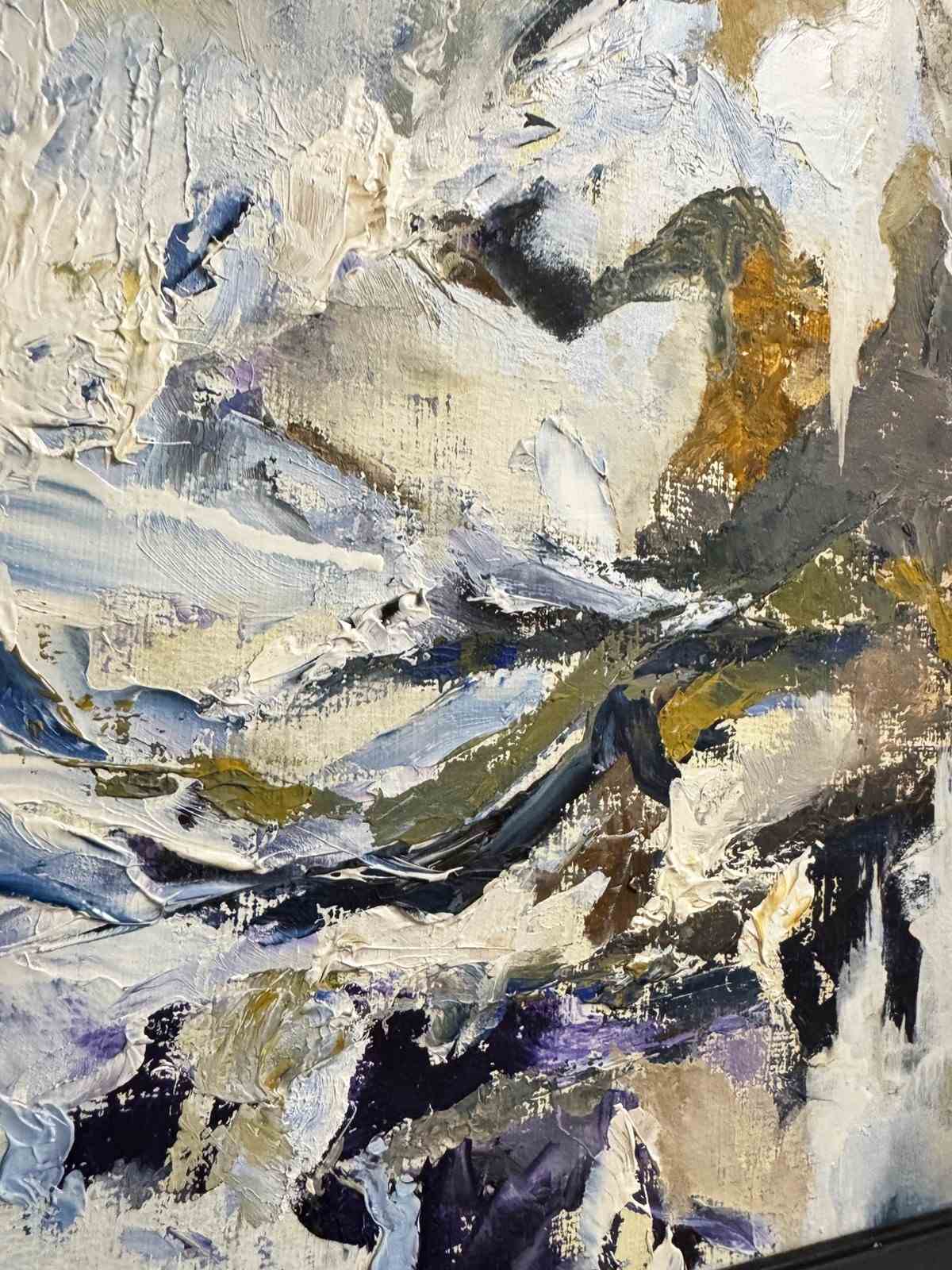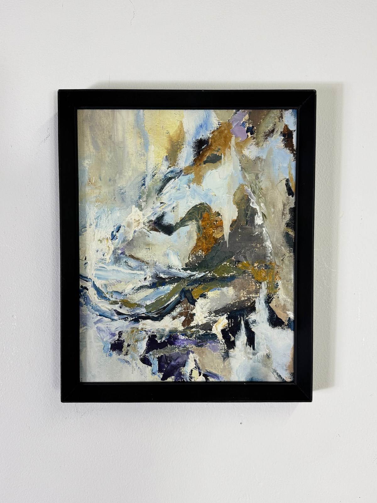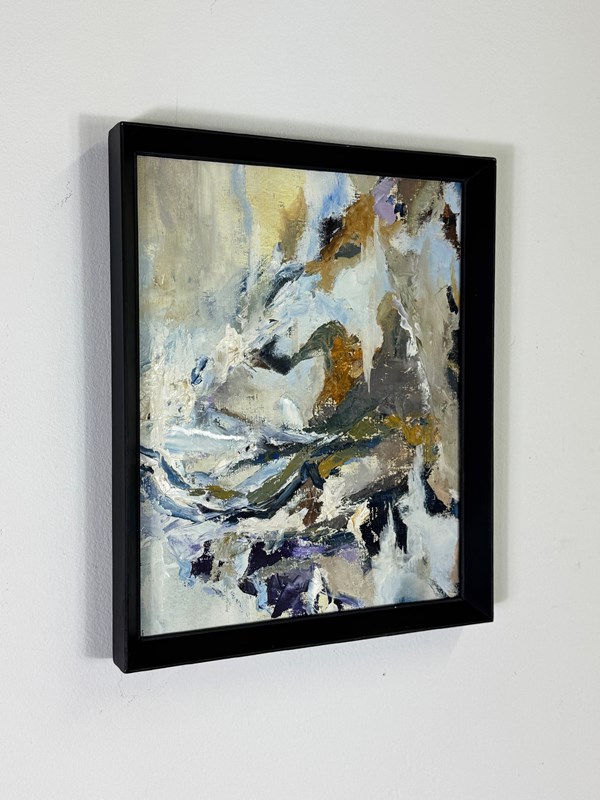 An expressive vintage abstract oil painting with soft yet dramatic brushwork. This piece combines muted tones of cream, grey and beige with accents of golden ochre, deep green, and hints of lavender and navy. The flowing composition and layered textures suggest natural movement. The black wedged frame adds a sleek, modern contrast that highlights the painting’s mid century character.