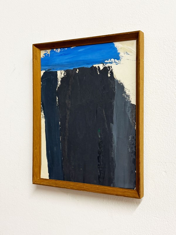 A striking Swedish abstract oil painting featuring deep black and slate tones contrasted with a vivid blue band and textured white accents, this piece brings a dramatic minimalist aesthetic to any room.