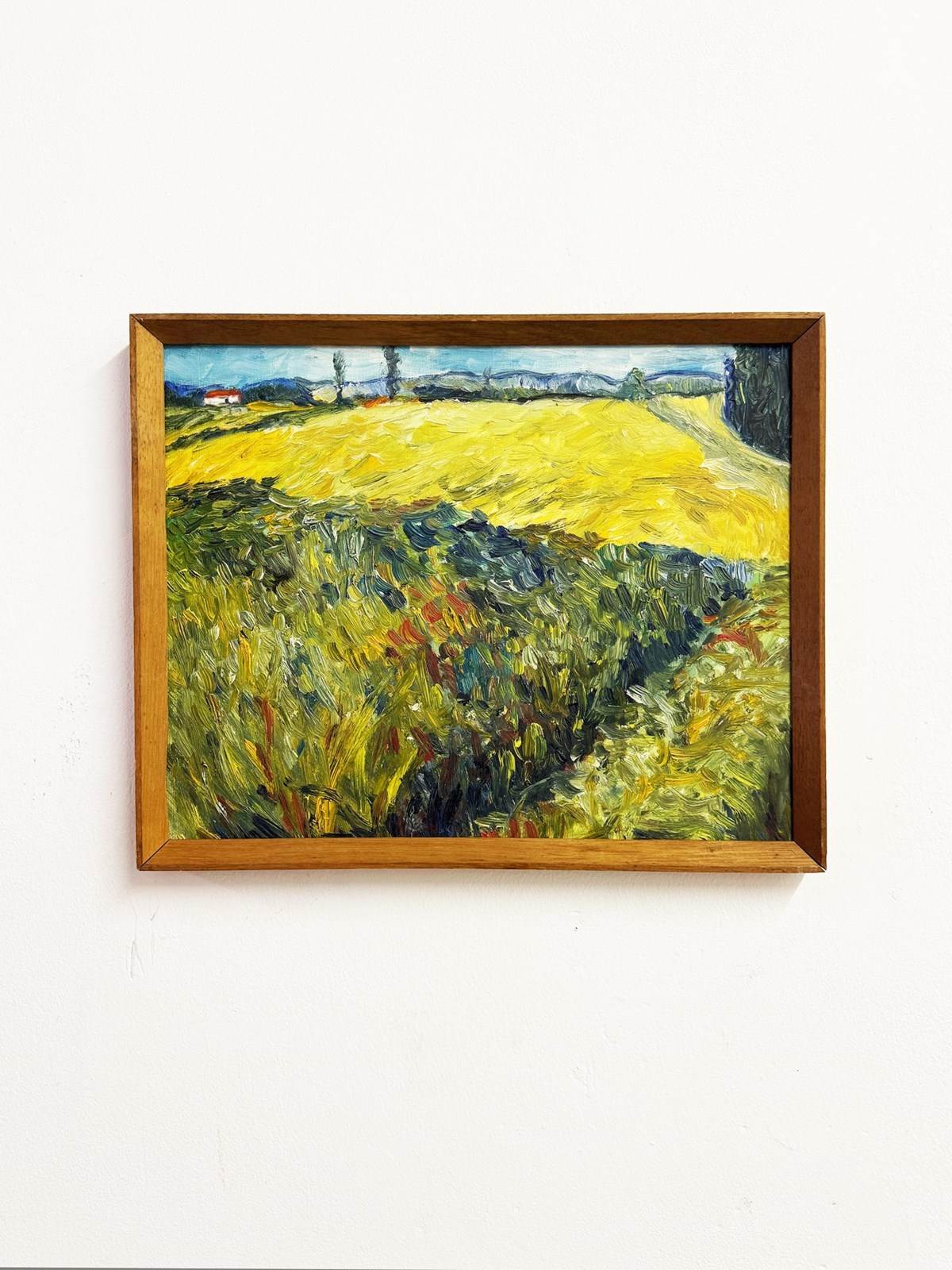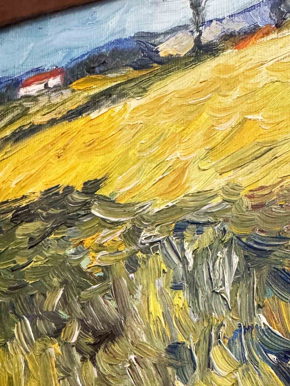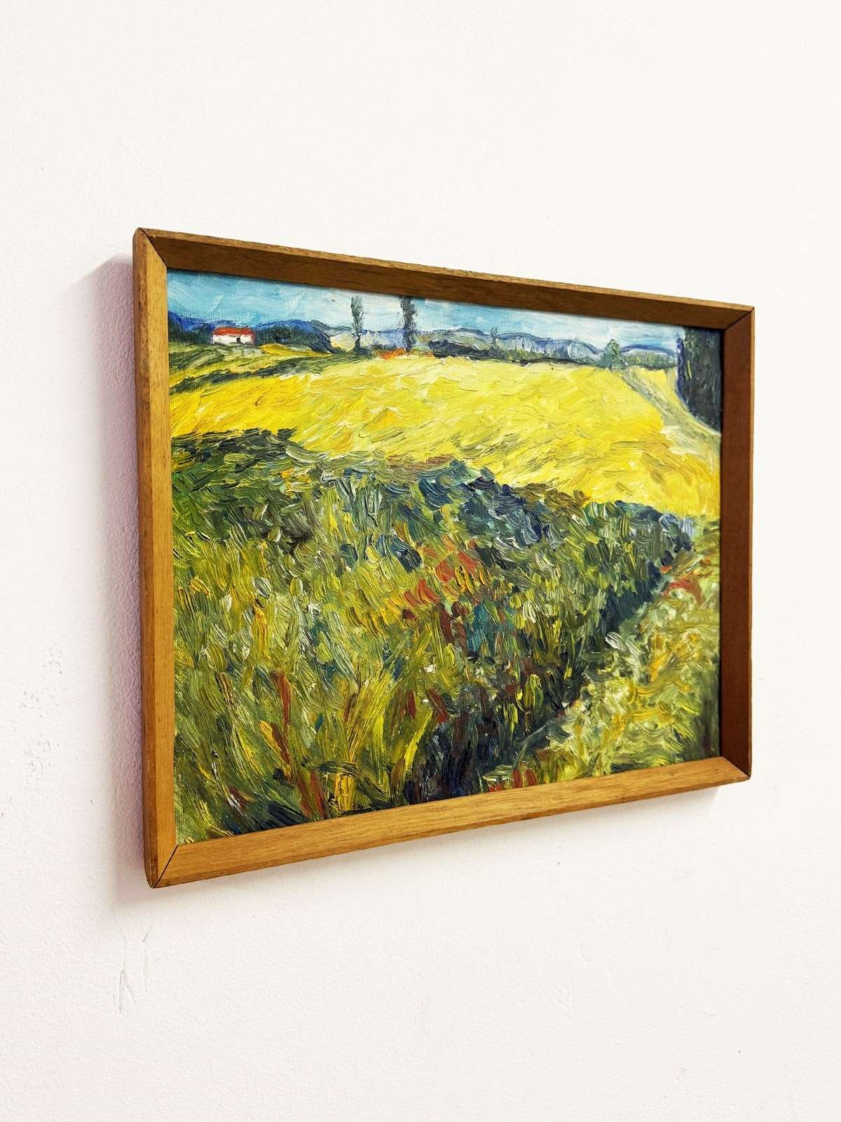 Beautiful original oil painting depicting a vibrant countryside scene with a golden field under a bright sky. The piece features bold expressive brushstrokes and rich texture, giving it a lively, almost Van Gogh–inspired feel.