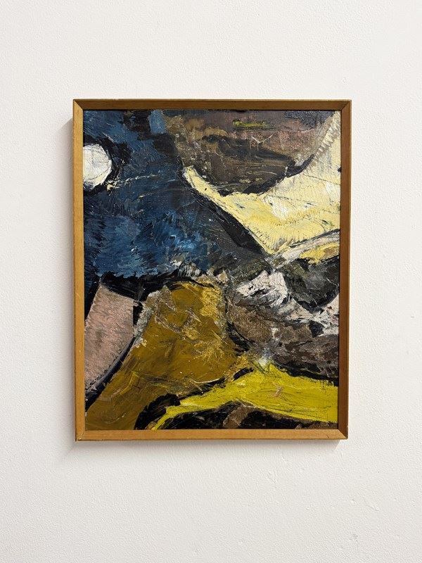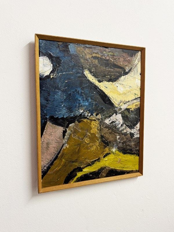 A bold and textured abstract painting that radiates movement and energy. This original vintage piece features dynamic strokes of deep navy, golden yellow, earthy browns, and soft creams layered together to create a dramatic composition. The impasto texture gives the artwork depth and presence, making it a captivating focal point in any room.