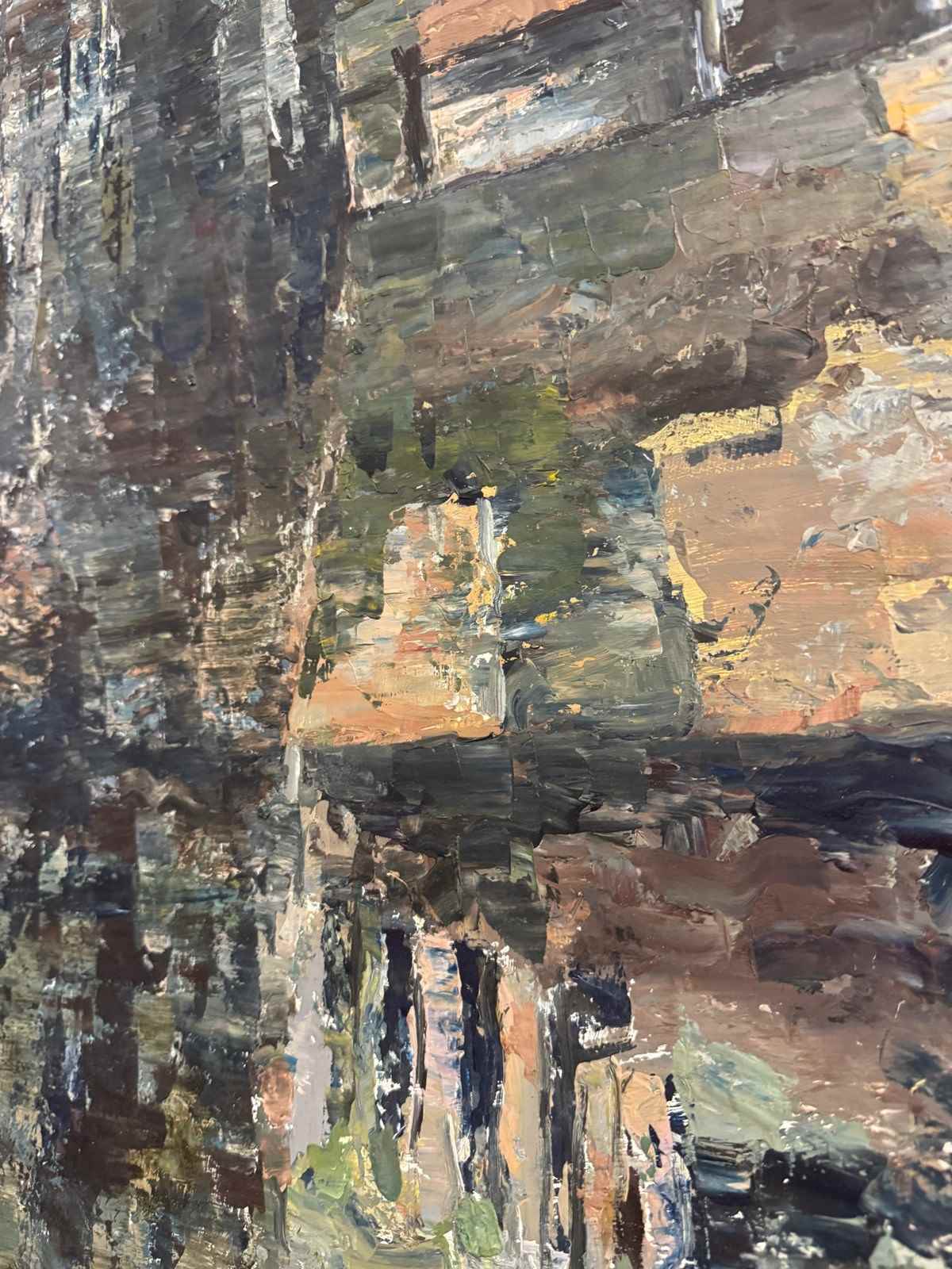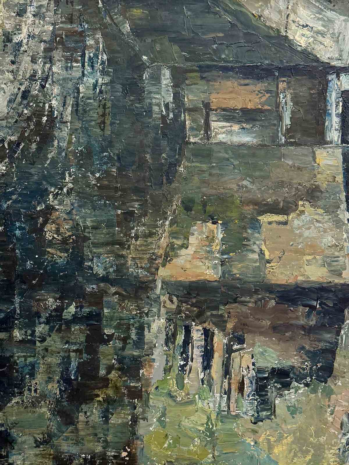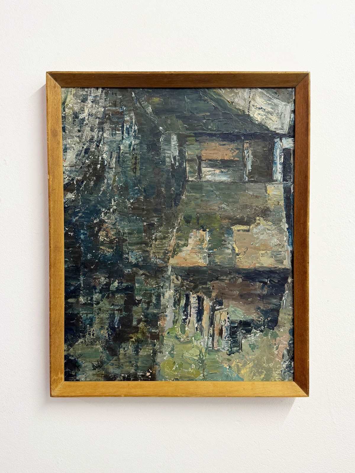 An original vintage oil painting with rich texture and depth. Bold palette knife strokes create an abstract composition in earthy greens, deep blues, browns and soft neutrals. The layered surface gives the piece an atmospheric quality. Presented in a period wooden wedged frame that highlights its mid century modern style.