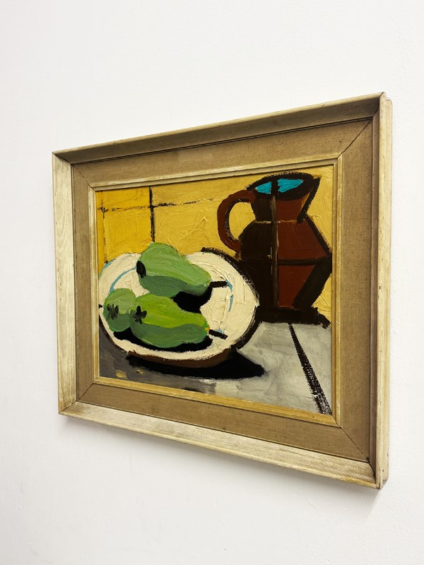 Celebrate Scandinavian simplicity with this vintage still life oil painting, painted in a bold mid century modern style. Featuring three green fruits on a white ceramic plate alongside a rustic jug, the composition reflects the clean lines and understated elegance typical of Swedish design. Expressive brushstrokes and a warm, earthy palette bring timeless minimalist charm to the piece.