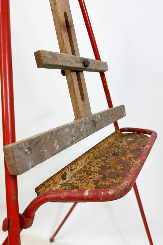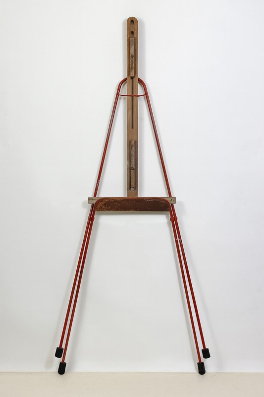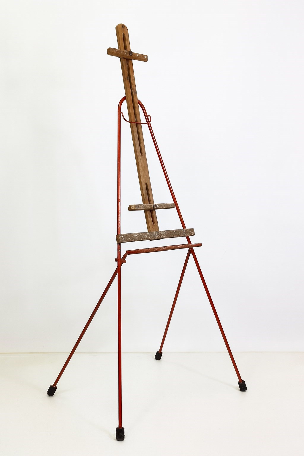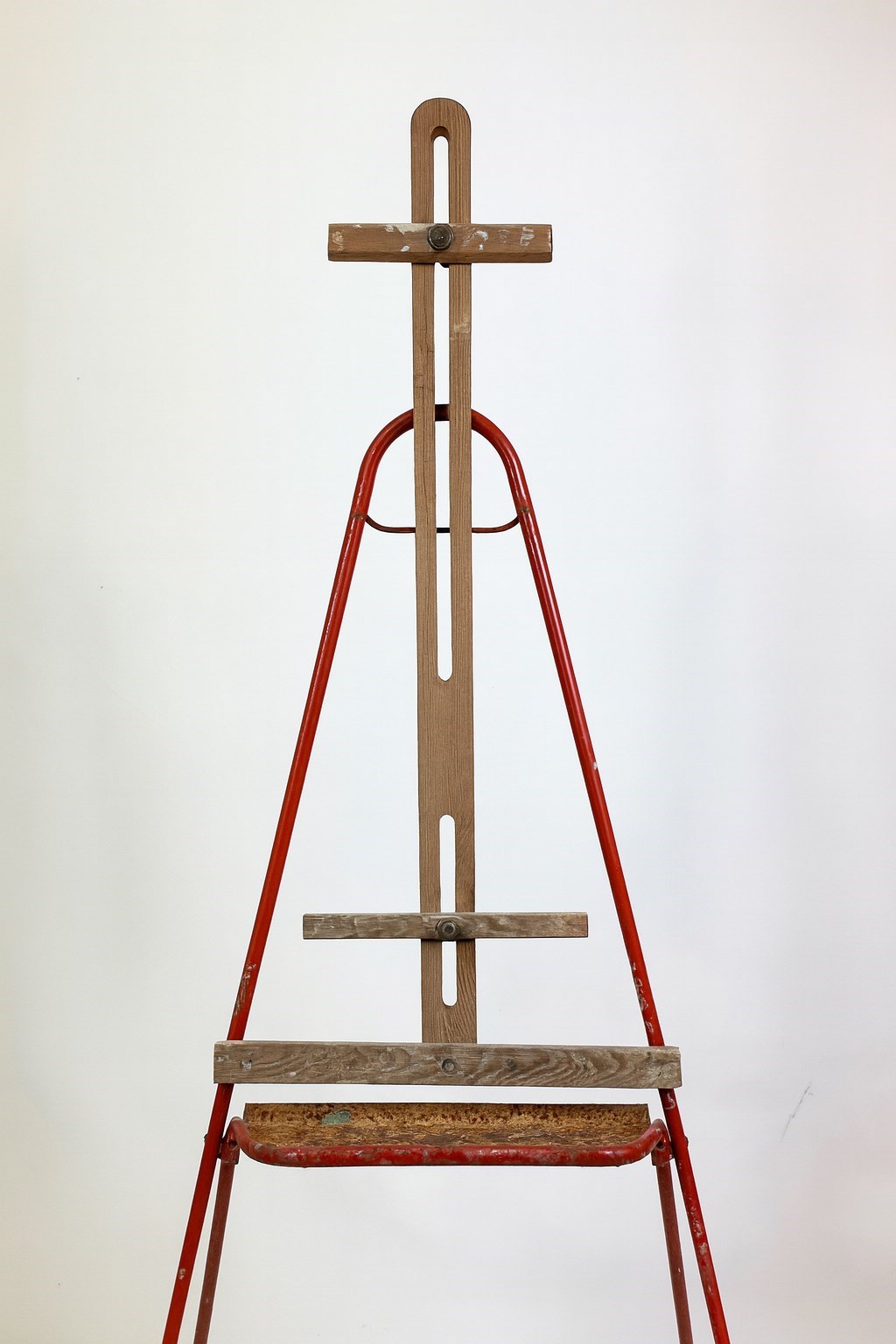 Bring timeless charm to your studio with this vintage artist easel, featuring a classic wooden center support and sturdy red metal tripod legs. Its adjustable design makes it perfect for holding canvases while painting, sketching, or drawing and it also doubles beautifully as a display easel for showcasing artwork, signs, or photos.