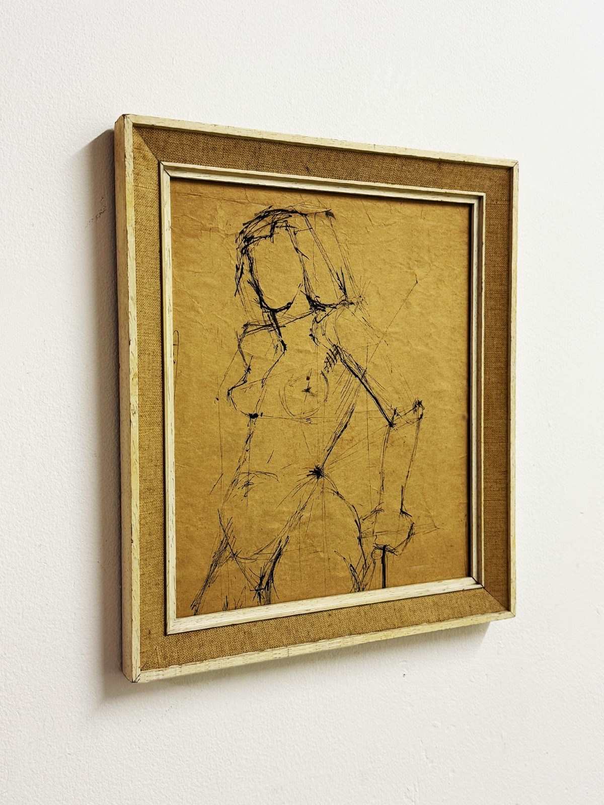 Bring a touch of expressive minimalism to your space with this study of a captivating ink sketch on textured paper, by Trata Derecha / Mahoney. The artwork features a loosely rendered female figure, created with energetic, gestural lines that highlight the raw spontaneity of the artist’s hand. The absence of facial details draws attention to the dynamic posture and flowing contours of the form, giving the piece a sense of motion and emotion. Framed in a vintage wooden frame with a linen-textured border, this piece blends organic warmth with modern artistic simplicity.