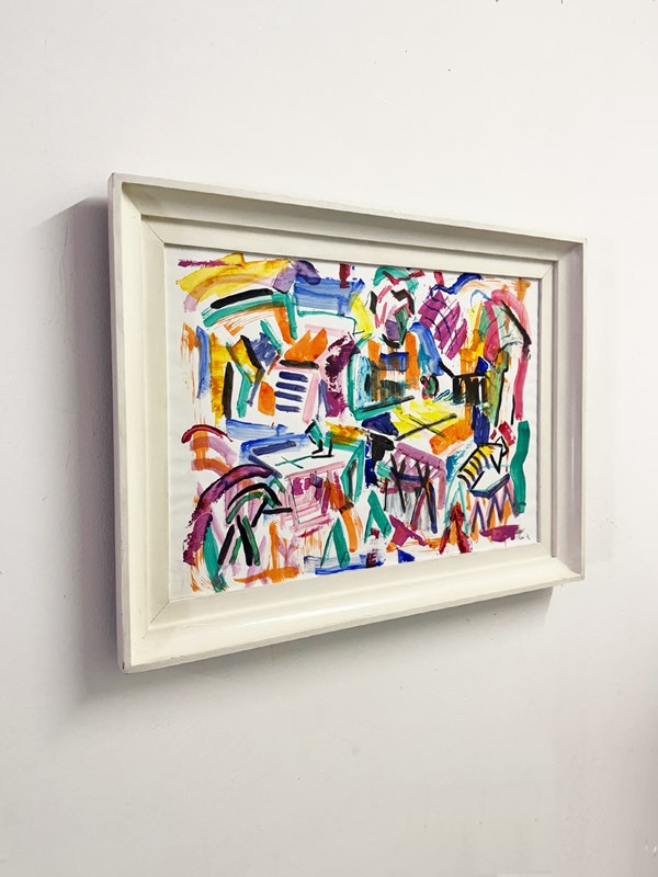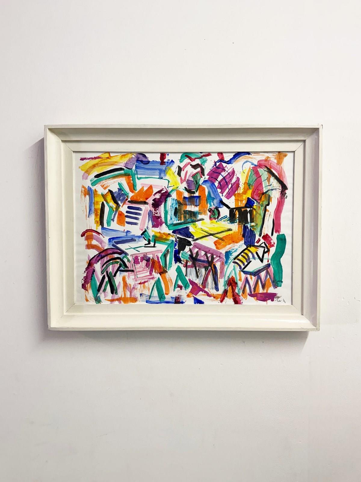 A vibrant abstract painting featuring energetic brushwork, bold colours and playful geometric forms. Layers of expressive marks in pink, blue, green, yellow and orange create a dynamic and lively composition.