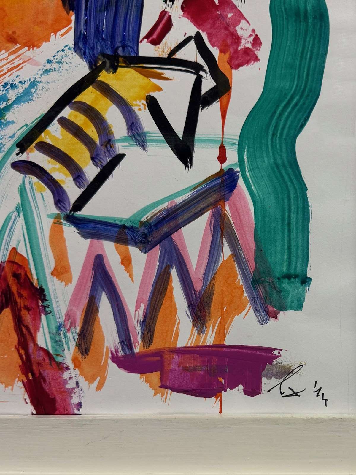 Signed and dated 1974, the work reflects the spirit of abstract expressionism and mid-century modern art. Presented in a white wooden frame and ready to hang, it makes a striking addition to any contemporary interior or art collection.